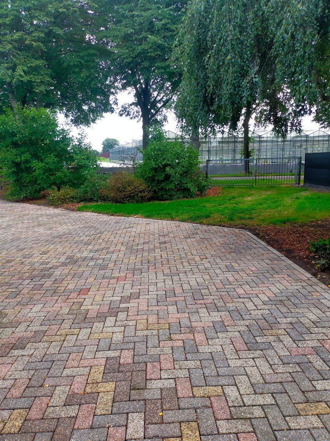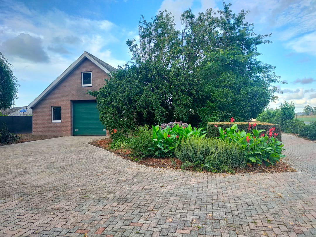 Aan de voorzijde voorzien van 2 poorten. Aan de rechterzijde van het deze ruimte is nog een betegeld terras aanwezig met enkele sierbomen, waar lekker genoten kan worden van zowel zon als schaduw.