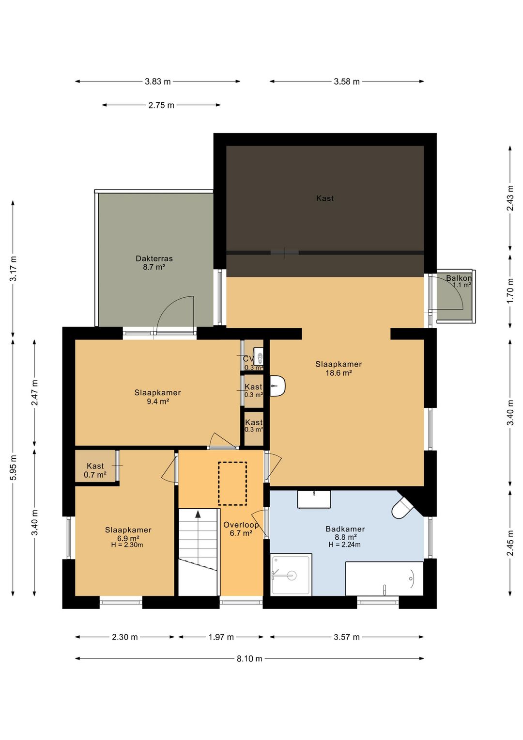 Eerste verdieping; via de overloop zijn een drietal slaapkamers van verschillende afmetingen en een ruime badkamer voorzien van ligbad, douche, toilet en wastafel te bereiken.