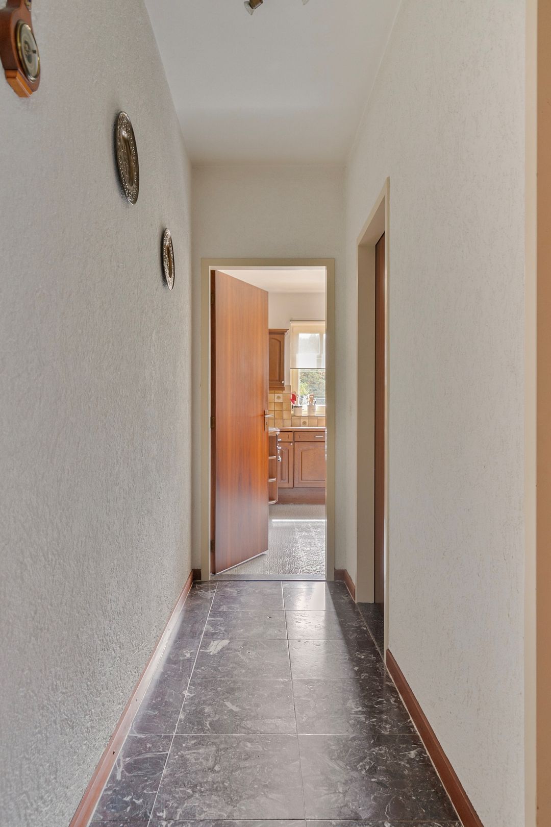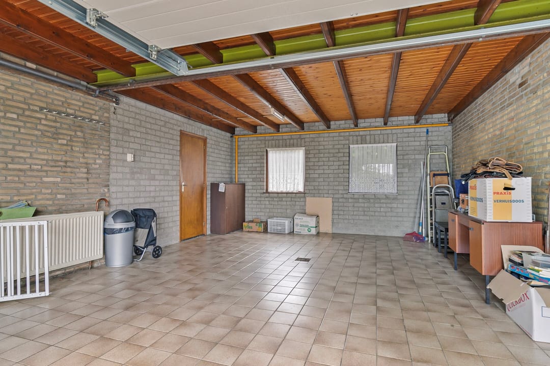 Begane grond: entreehal met trapopgang met kastruimte, 3 slaapkamers waarvan 2 met inbouwkasten, woonkamer, keuken met L-vormige opstelling, gang, badkamer met ligbad/douche, toilet en wastafel, bijkeuken met witgoedaansluitingen en uitstortgootsteen, toilet, overdekt terras, garage met automatische roldeur (3 x 2,10 m). De garage is eveneens een overdekte verbinding tussen de woning en de loodsen.
