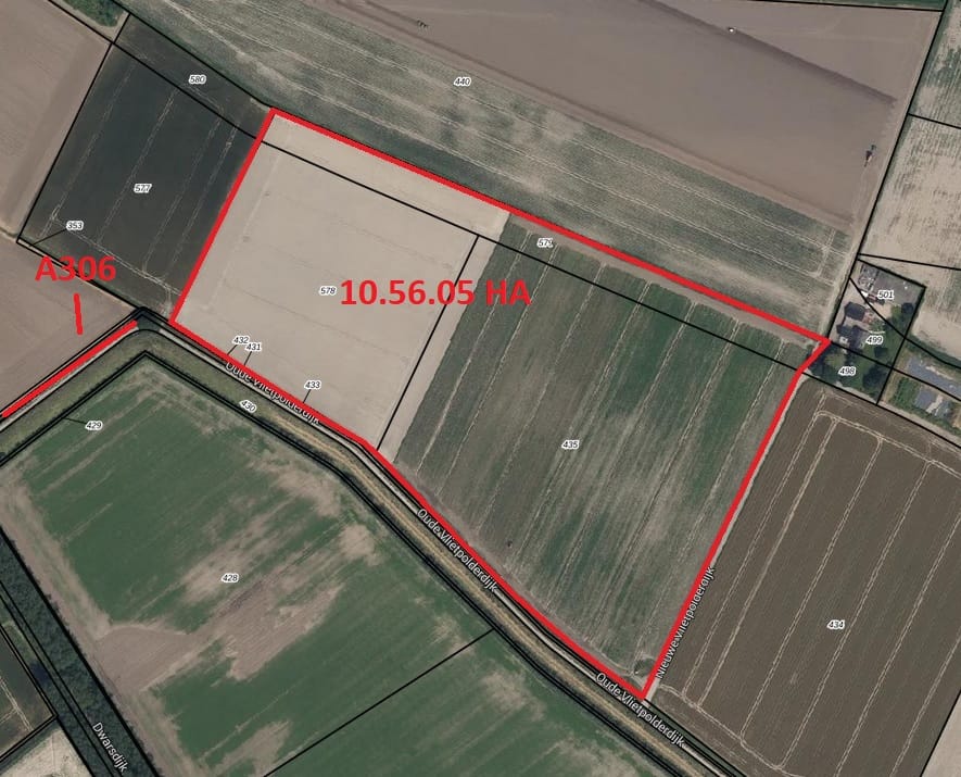 Aan de Oude Vlietpolderdijk gelegen een perceel (bestaande uit vier kadastrale nummers) met een oppervlakte van totaal 10.56.05 HA (waarvan circa 60 ca bermstrook betreft).