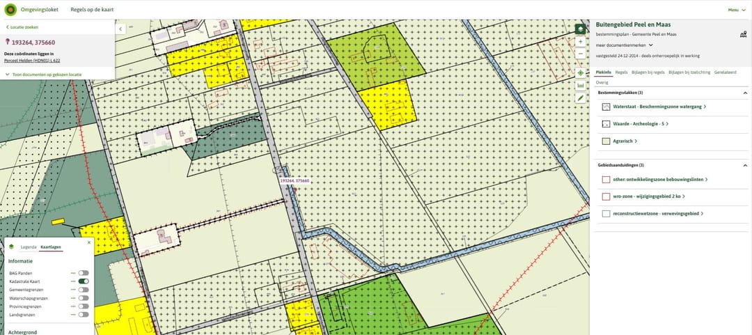 Het perceel is gelegen in het bestemmingsplan 'Buitengebied Peel en Maas' van de gemeente Peel en Maas. Binnen dit bestemmingsplan heeft het perceel deels de enkelbestemming 'Agrarisch', deels dubbelbestemming 'Waarde - Archeologie - 5' en deels 'Waterstaat - Beschermingszone watergang' en de gebiedsaanduidingen 'Other: ontwikkelingszone bebouwingslinten', 'Wro-zone - wijzigingsgebied 2 ko' en 'Reconstructiewetzone - verwevingsgebied'.
