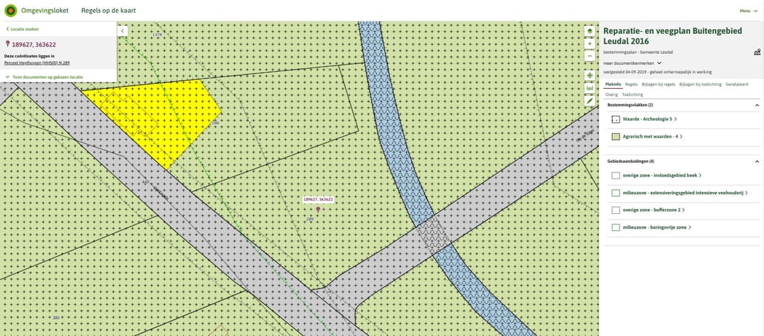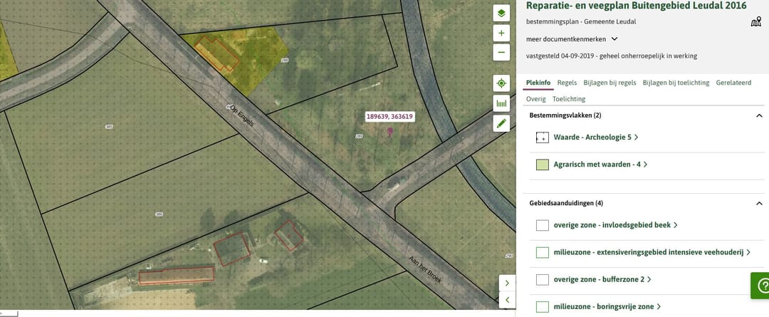 Het perceel is gelegen in het bestemmingsplan 'Reparatie- en veegplan Buitengebied Leudal 2016' van de gemeente Leudal. Binnen dit bestemmingsplan heeft het perceel de enkelbestemming 'Agrarisch met waarden - 4' en de dubbelbestemming 'Waarde - Archeologie 5'.