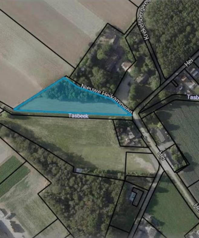 De ligging: het perceel ligt tussen de woonobjecten Hei 7 en Hei 9 in Kessel-Eik, en via het pad langs de Tasbeek stap je zo te paard de Heldense bossen in.