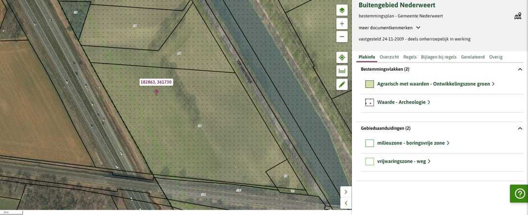 Het perceel is gelegen in het bestemmingsplan 'Buitengebied Nederweert' van de gemeente Nederweert. Binnen dit bestemmingsplan heeft het perceel de enkelbestemming 'Agrarisch met waarden - Ontwikkelingszone groen' en de dubbelbestemming 'Waarde - Archeologie'.