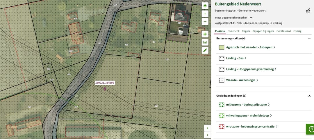 Het perceel is gelegen in het bestemmingsplan 'Buitengebied Nederweert' van de gemeente Nederweert. Binnen dit bestemmingsplan heeft het perceel de enkelbestemming 'Agrarisch met waarden - Esdorpen', deels de dubbelbestemming 'Waarde - Archeologie', deels', deels 'Leiding - Gas', deels 'Leiding - Hoogspanningsverbinding' en de gebiedsaanduidingen 'Milieuzone - boringsvrije zone', 'Vrijwaringszone - molenbiotoop' en 'Wro-zone - bebouwingsconcentratie'.