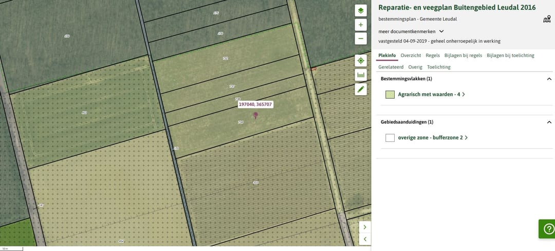 Het perceel is gelegen in het bestemmingsplan 'Reparatie- en veegplan Buitengebied Leudal 2016' van de gemeente Leudal. Binnen dit bestemmingsplan heeft het perceel de enkelbestemming 'Agrarisch met waarden - 4' en de gebiedsaanduiding 'Overige zone - bufferzone 2'.