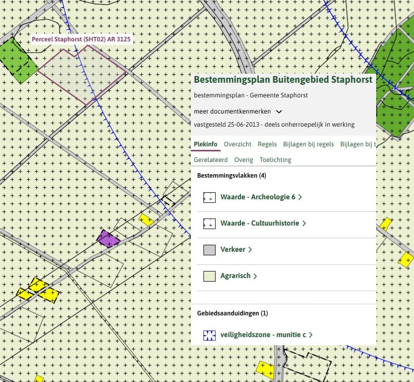 Bestemmingsplan: Enkelbestemming Agrarisch, Dubbelbestemmingen Waarde – Archeologie 6, Waarde-cultuurhistorie en veiligheidszone – munitie c;