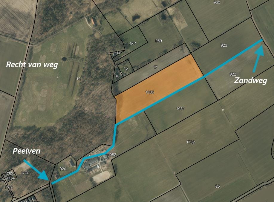 - Het perceel is ontsloten middels een recht van weg (overpad) en hierdoor te bereiken vanaf twee zijden. Via de inrit van Peelven 2 en middels achtergelegen zandweg. Aan de rechter zijde van het perceel bevindt zich een betonpad (kavelpad) welke overgaat in gras.