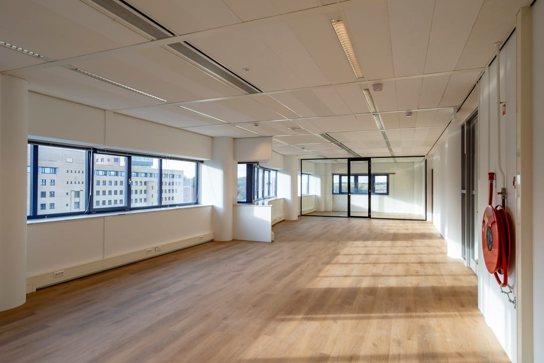 - Lichtinval: Veel natuurlijke lichtinval door ramen aan weerszijden van de kantoorvloeren.