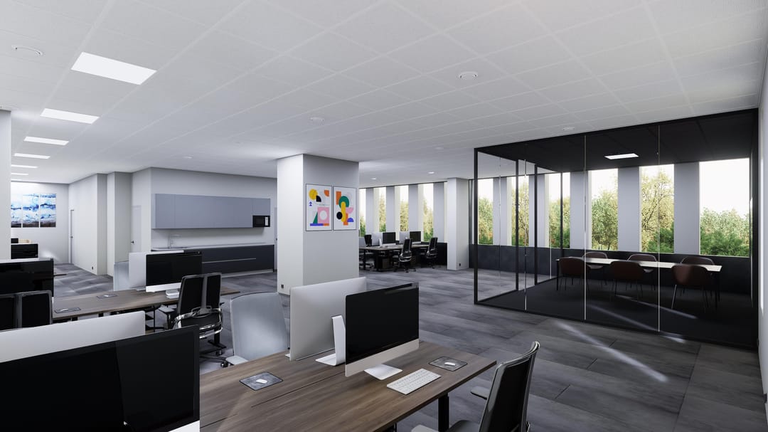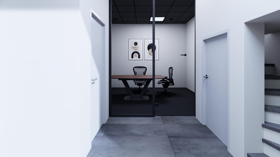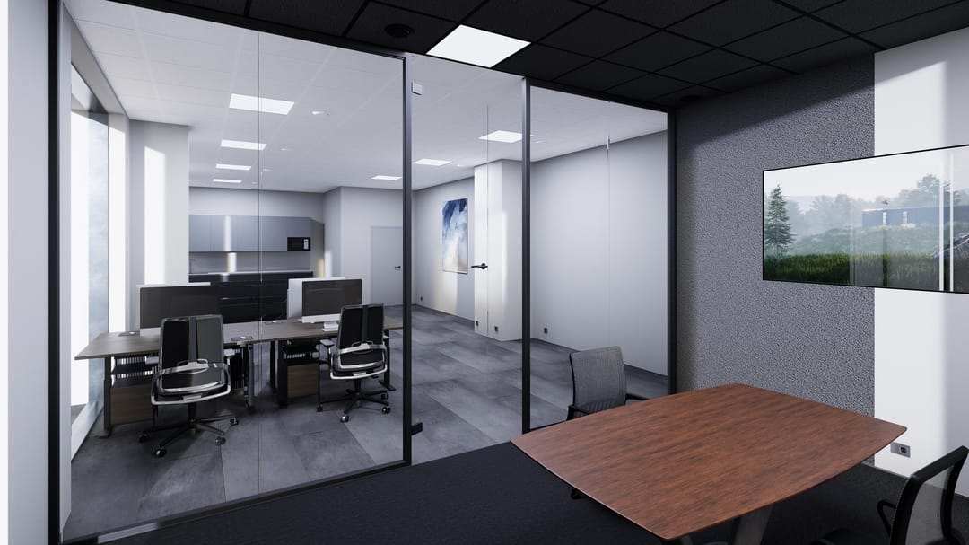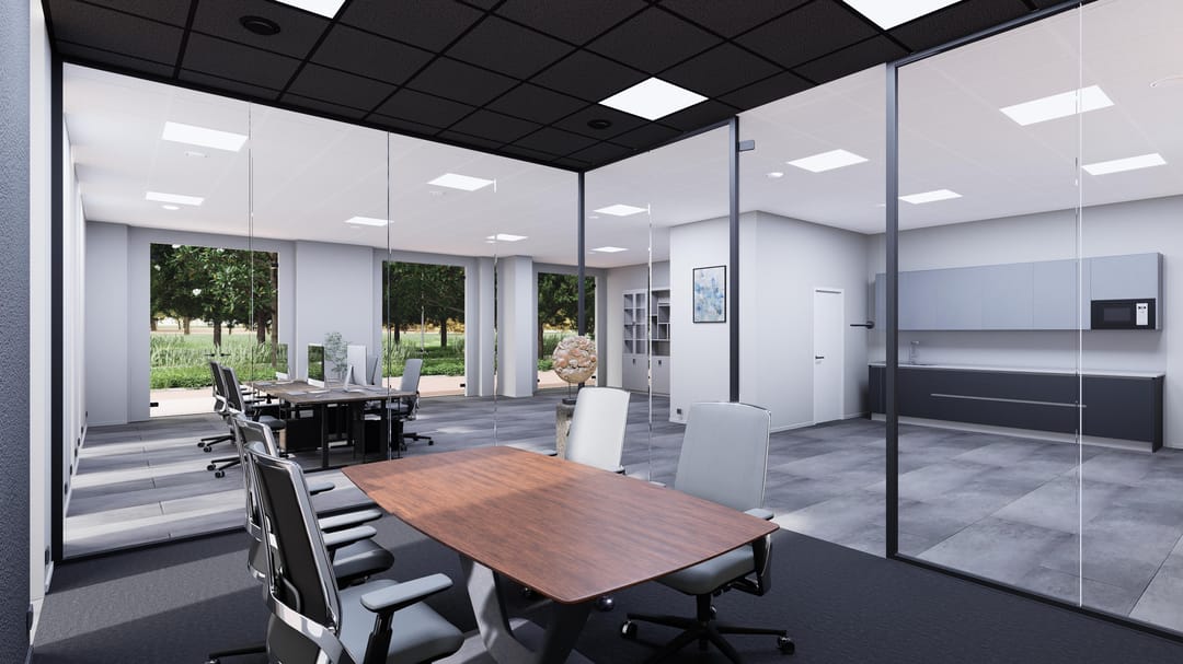 - Glazen vergaderruimten met onderscheidend plafond en tapijt;