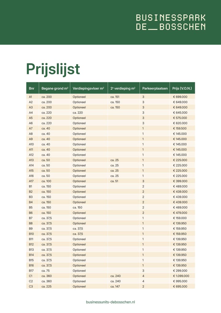 In De Bosschen komen businessunits met een begane-grond-oppervlakte van: 40 – 50 – 60 – 80 – 90 – 110 – 130 – 160 – 200 – 220 – 275 – 360 m². Het gebruiksoppervlak kunt u eenvoudig verdubbelen met een verdiepingsvloer. Dat kunnen wij tijdens de bouw voor u realiseren, of u laat dit later zelf doen. Bij een deel van de units is zelfs een derde laag gerealiseerd, perfect voor extra werkruimte of een kantine.