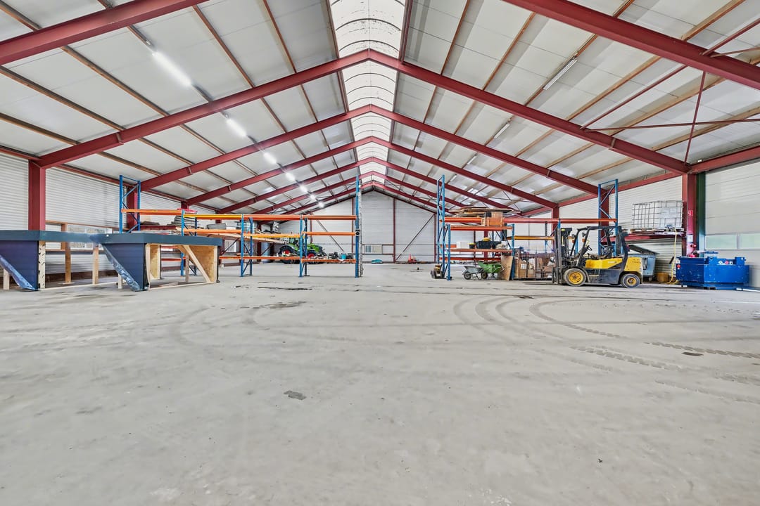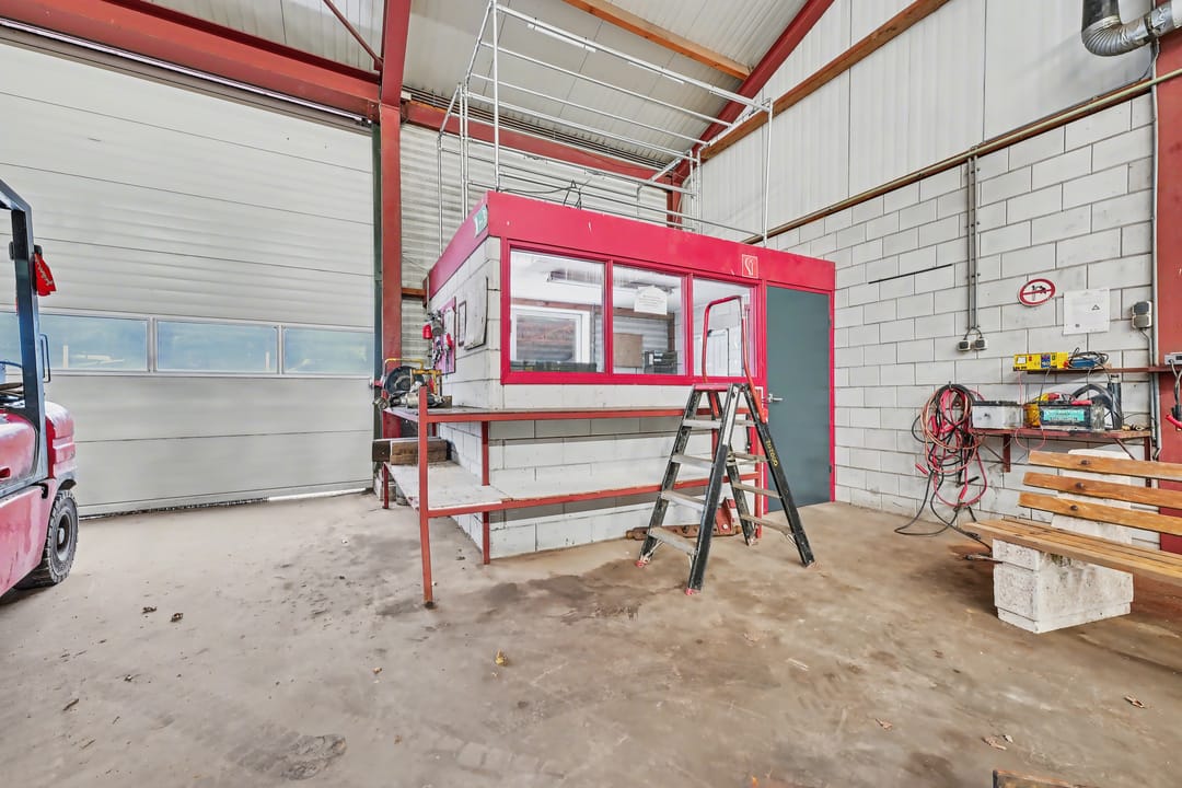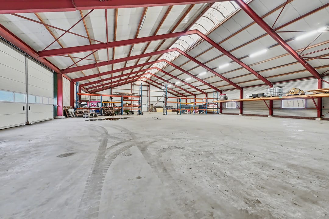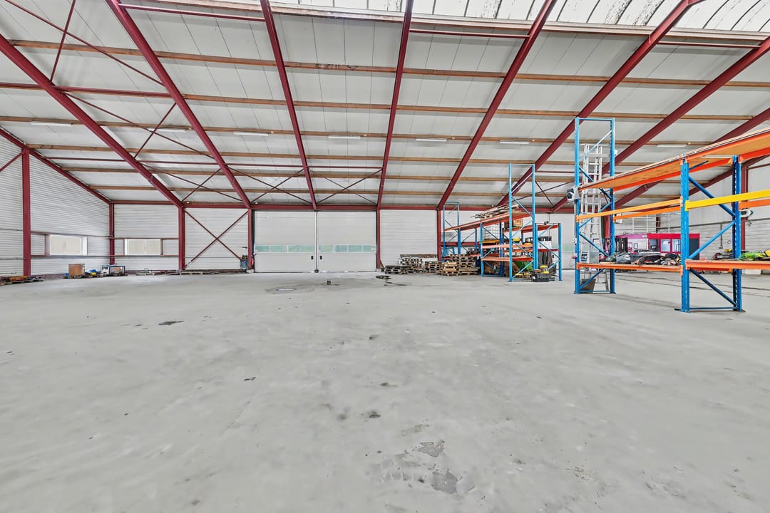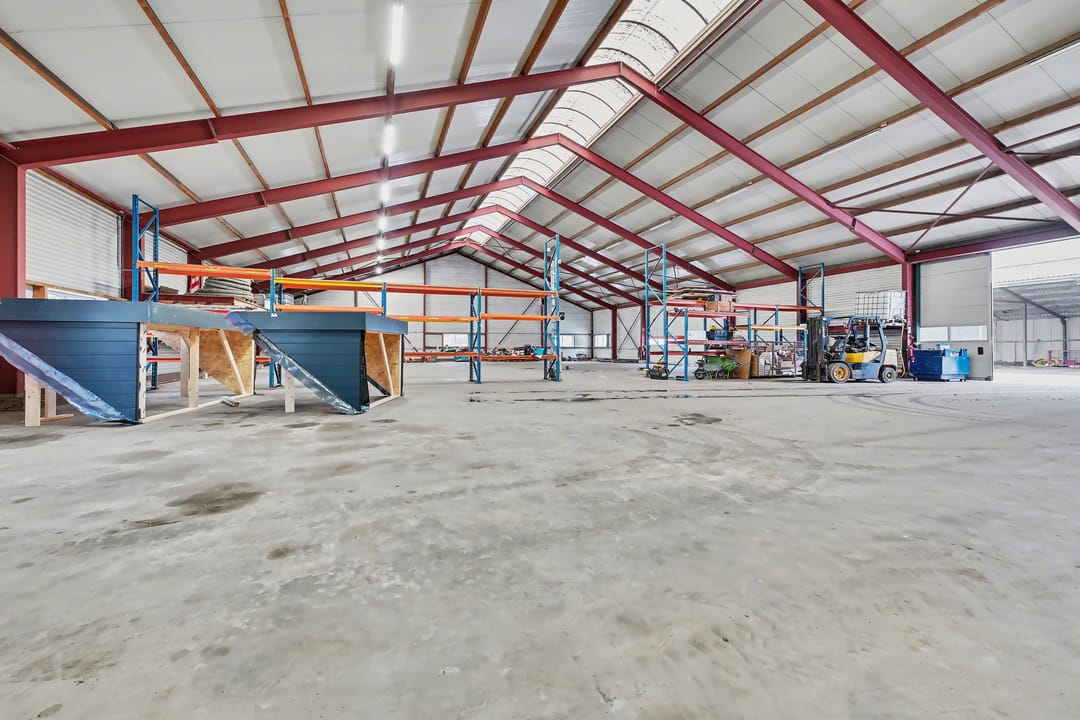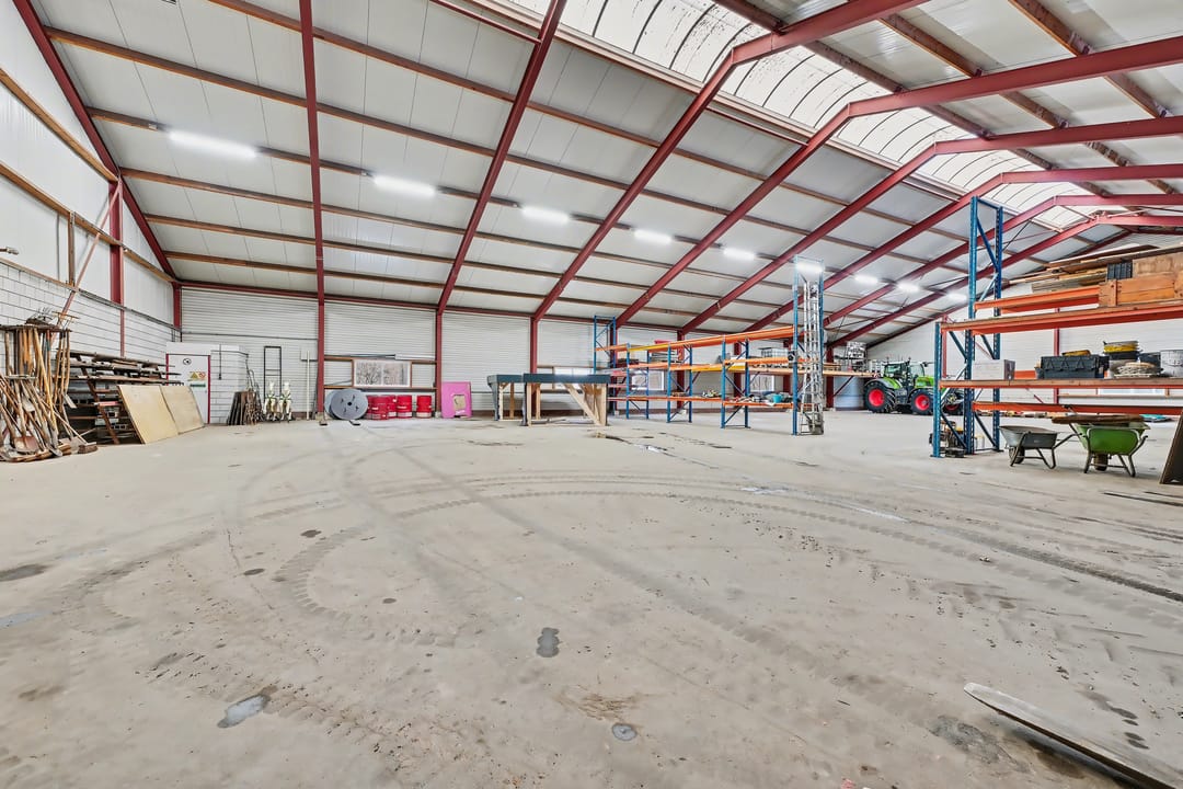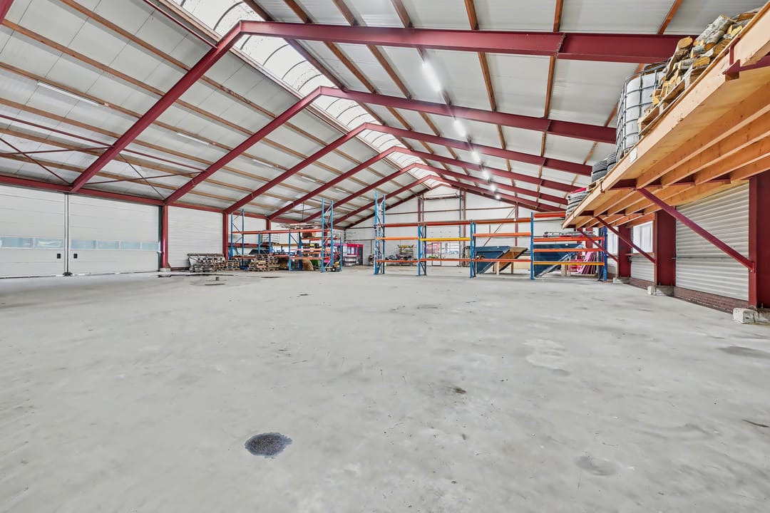 De loods (ca. 913 m² BVO) is uitgevoerd in staalconstructie en volledig vrij overspannen, wat zorgt voor optimale indelingsvrijheid. De betonnen vloer maakt de ruimte geschikt voor diverse bedrijfsactiviteiten. Het dak is voorzien van geïsoleerde dakplaten met een lichtstraat, wat zorgt voor veel natuurlijke lichtinval. Daarnaast is over de volledige lengte TL-verlichting aangebracht.
