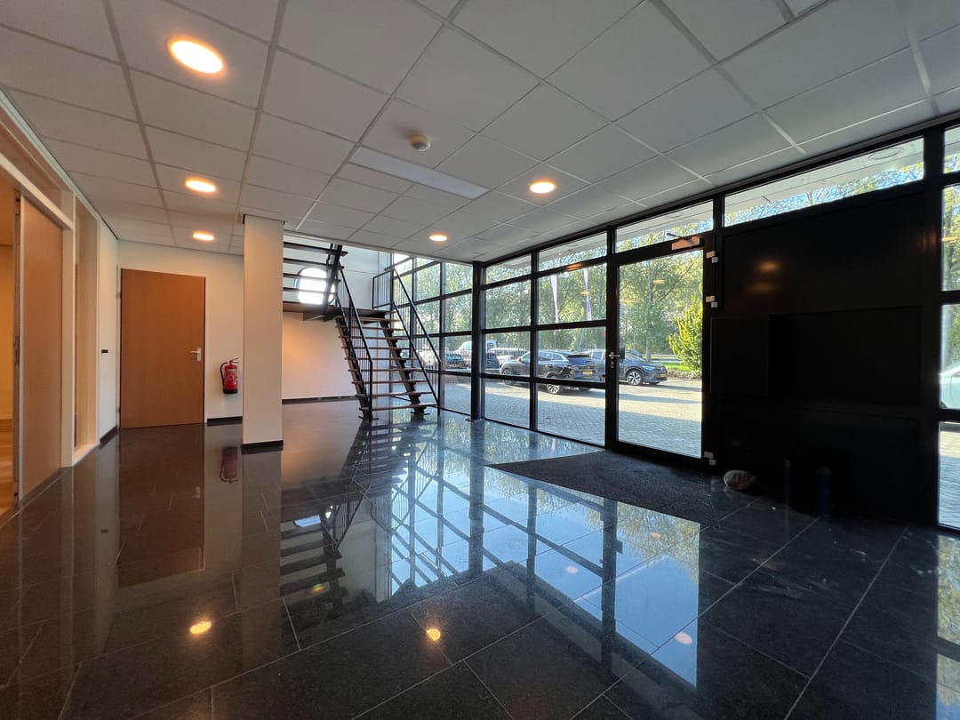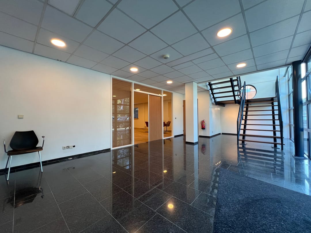 - representatieve entree/ontvangstruimte voorzien van natuursteen vloerafwerking, systeemplafond, betegelde toiletruimte met voorportaal en stalen bordestrap met hardhouten treden, alsmede een aangrenzende (afsluitbare) showroom die tevens beschikt over een doorgang naar de achtergelegen bedrijfsruimte;