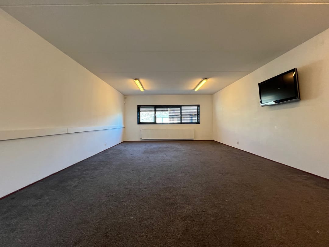 De bedrijfs-/kantoorunit is toegankelijk via een entree/hal aan de achterzijde van het complex met houten trapopgang naar de kantoorverdieping en via de elektrisch bedienbare overheaddeur met loopdeur in de voorgevel. De bedrijfsruimte op de begane grond is o.a. voorzien van een betonvloer met coating, elektrische overheaddeur, verlichtingsarmaturen, pantry en toiletruimte. De kantoorverdieping is o.a. voorzien van afgewerkte wanden en plafonds, verlichtingsarmaturen, verwarming, een pantry en een betegelde toiletruimte.