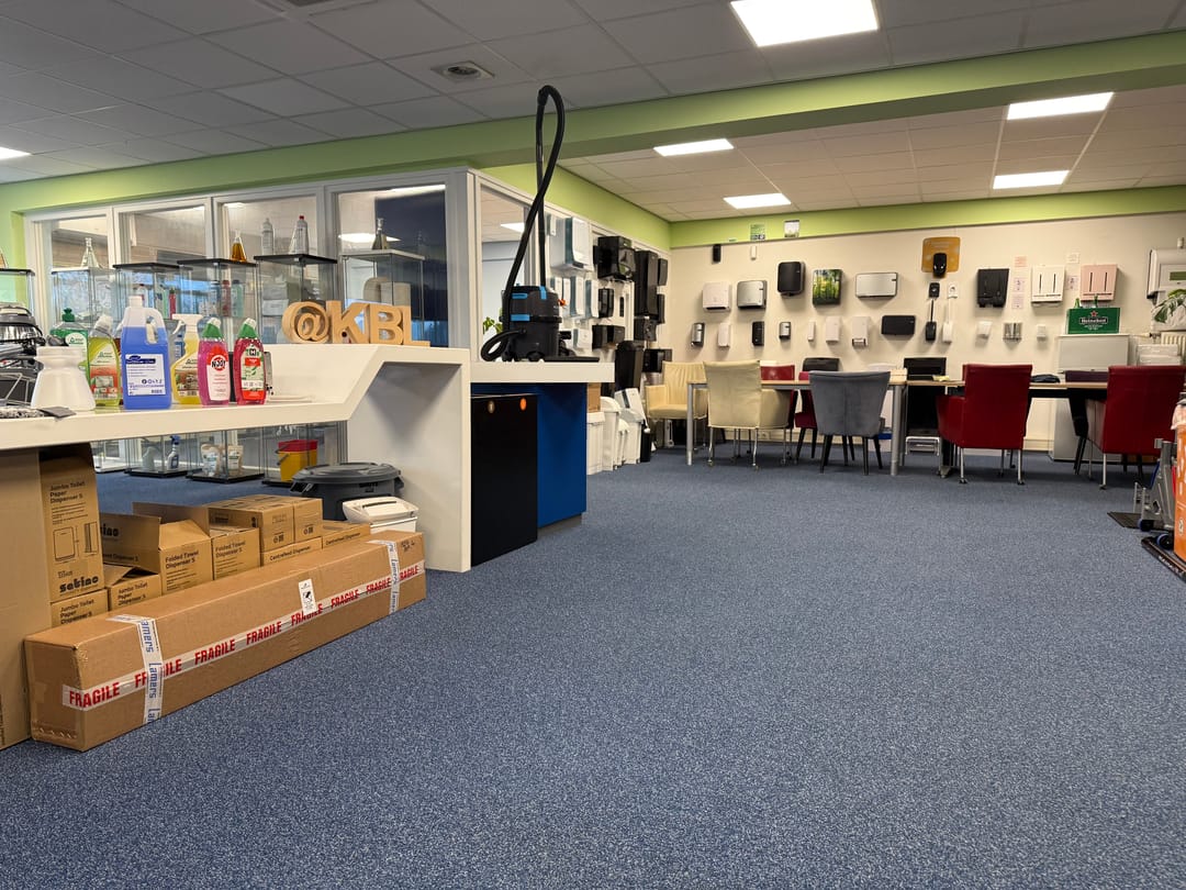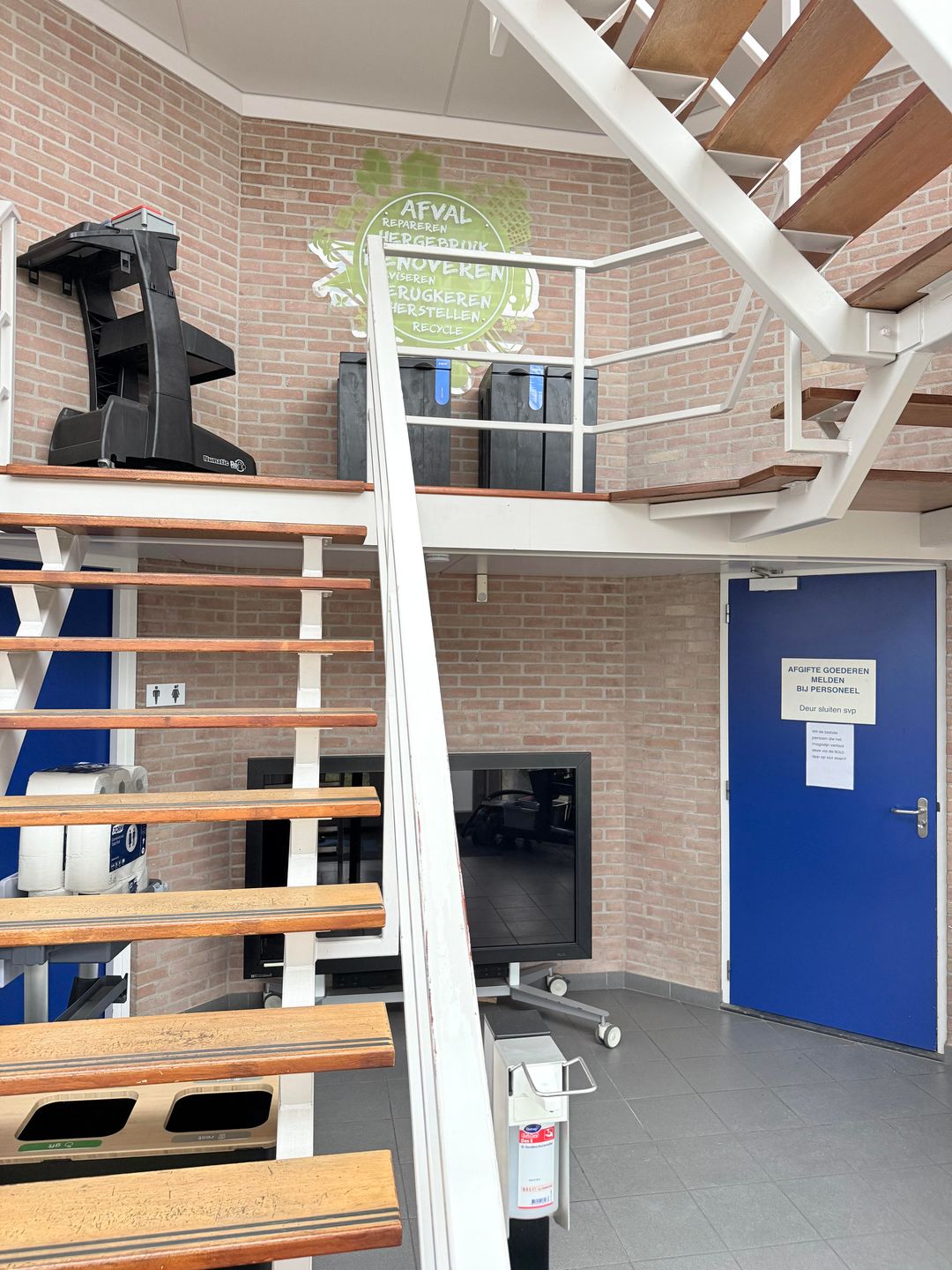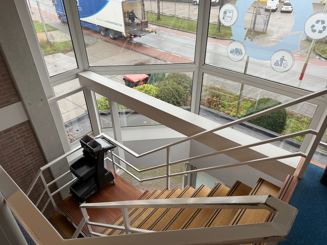 Via het trappenhuis aan de voorzijde is de 1e verdieping bereikbaar. Vanuit deze entree zijn ook de bedrijfsruimte en de toiletruimtes bereikbaar. Via een elektrisch bedienbare overheaddeur (circa 4.0 x 4.0 meter) aan de rechter voorzijde van het object is de bedrijfsruimte bereikbaar. Op de 1e verdieping (ca. 260 m² BVO) bevinden zicht diverse kantoorruimtes, een pantryblok, vergaderhoek en showroom.