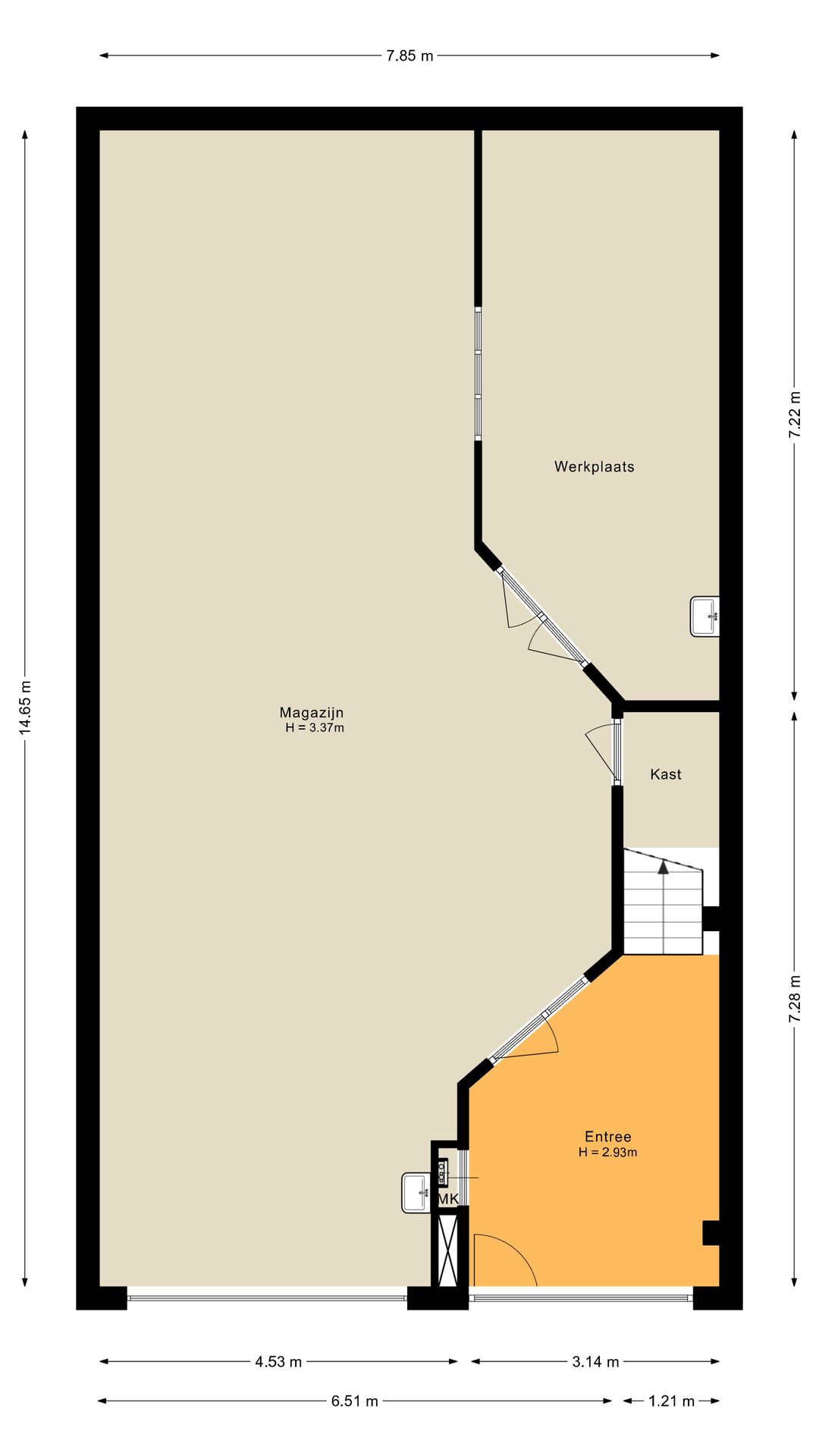 Ontvangst, opslag/bedrijfsruimte begane grond van circa 143 m²