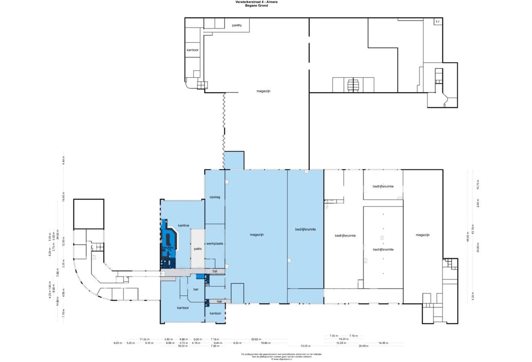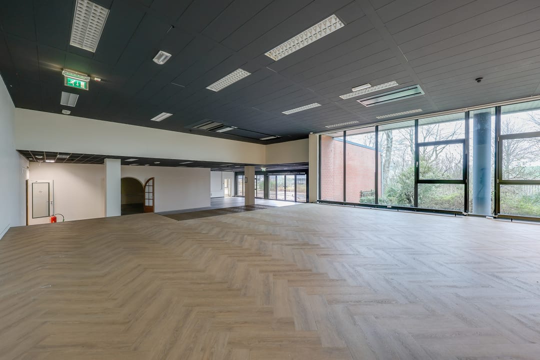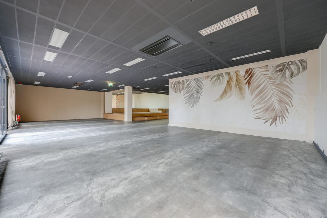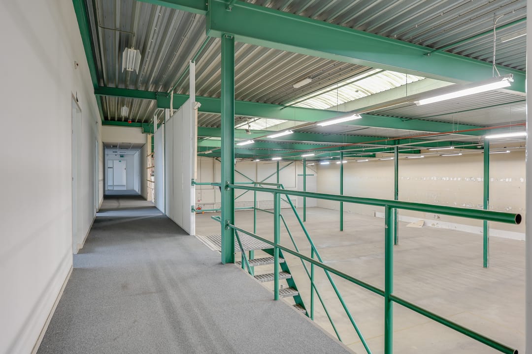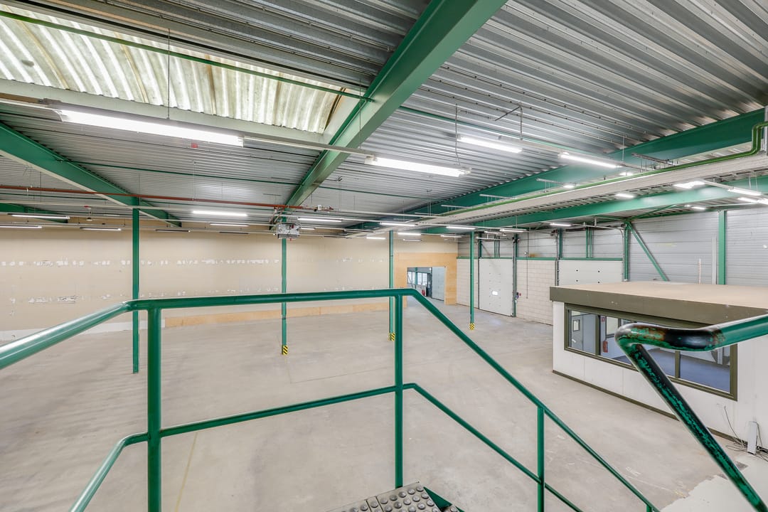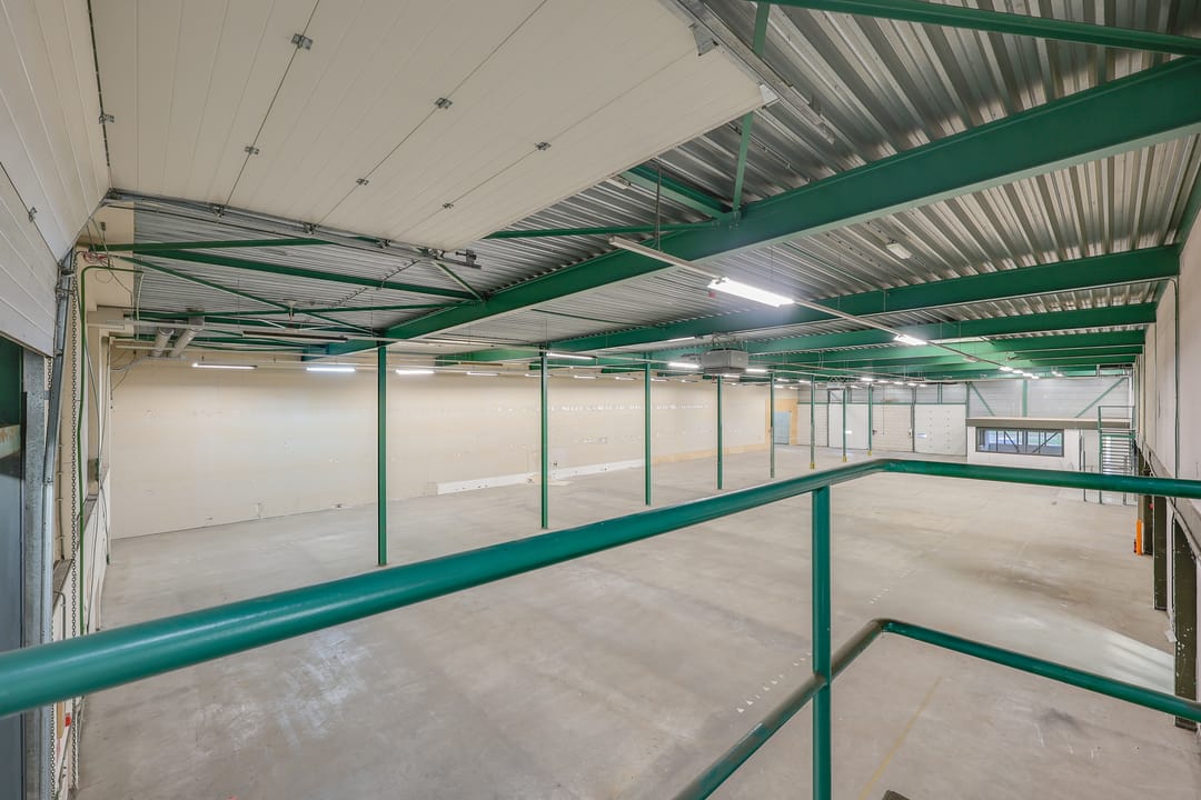 De te huren warehouse (links) bevindt zich op de begane grond en heeft een totale oppervlakte van circa 3.215 m², verdeeld over ongeveer 2.140 m² bedrijfsruimte, circa 750 m² kantoorruimte, circa 325 m² kantine en 343 m² mezzanine. De bedrijfsruimte is voorzien van 3 loading docks en 1 elektrische overheaddeur, wat de bereikbaarheid en het laden en lossen aanzienlijk vergemakkelijkt.