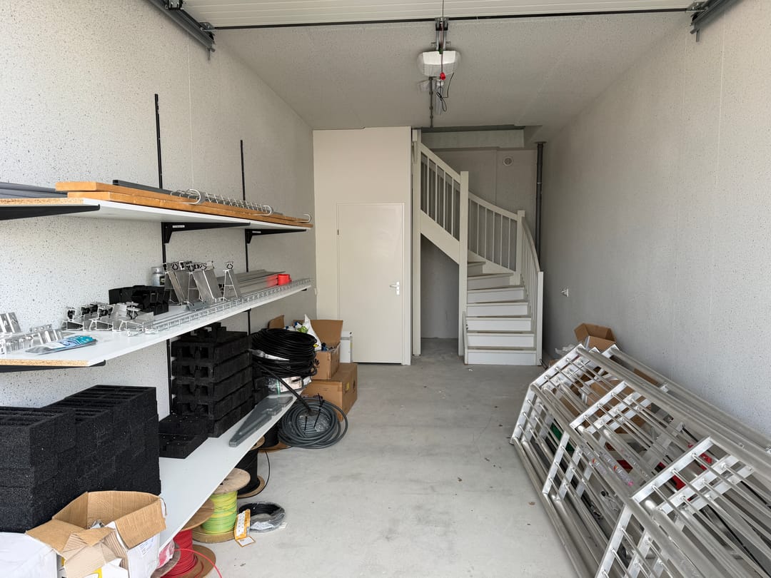 - Begane grond met sectionaaldeur, betonvloer (350 kg/m²), elektra, verlichting en toilet