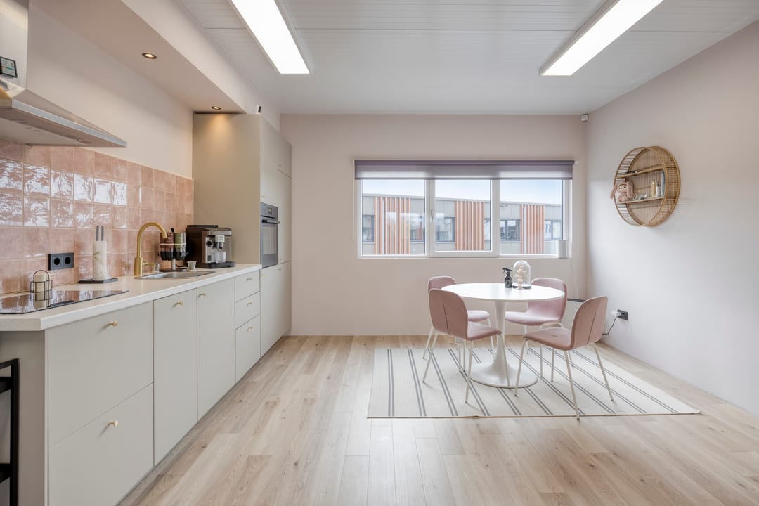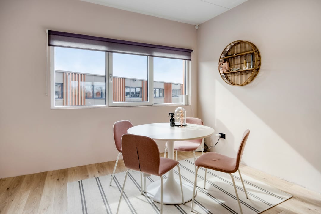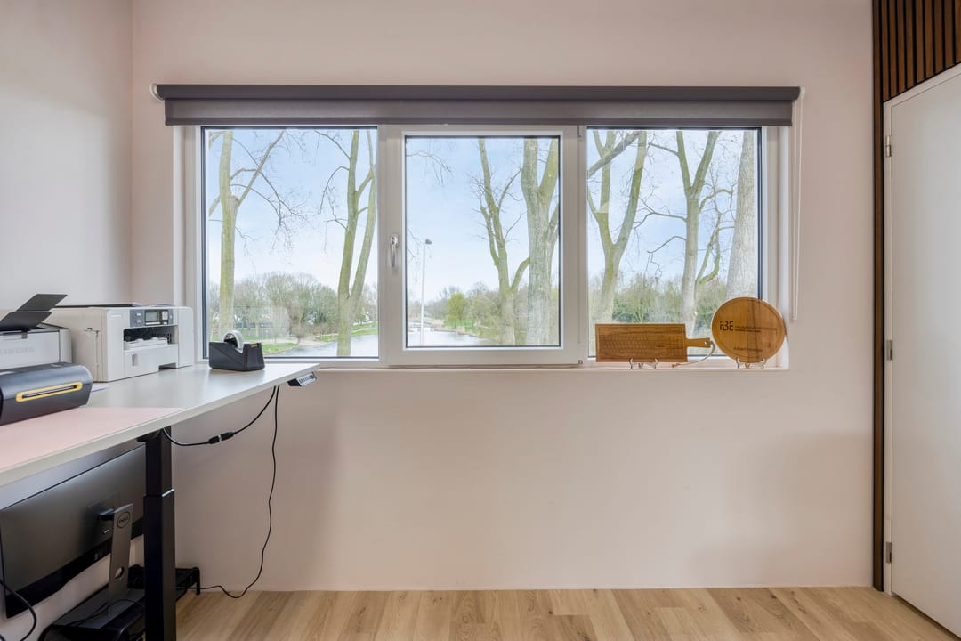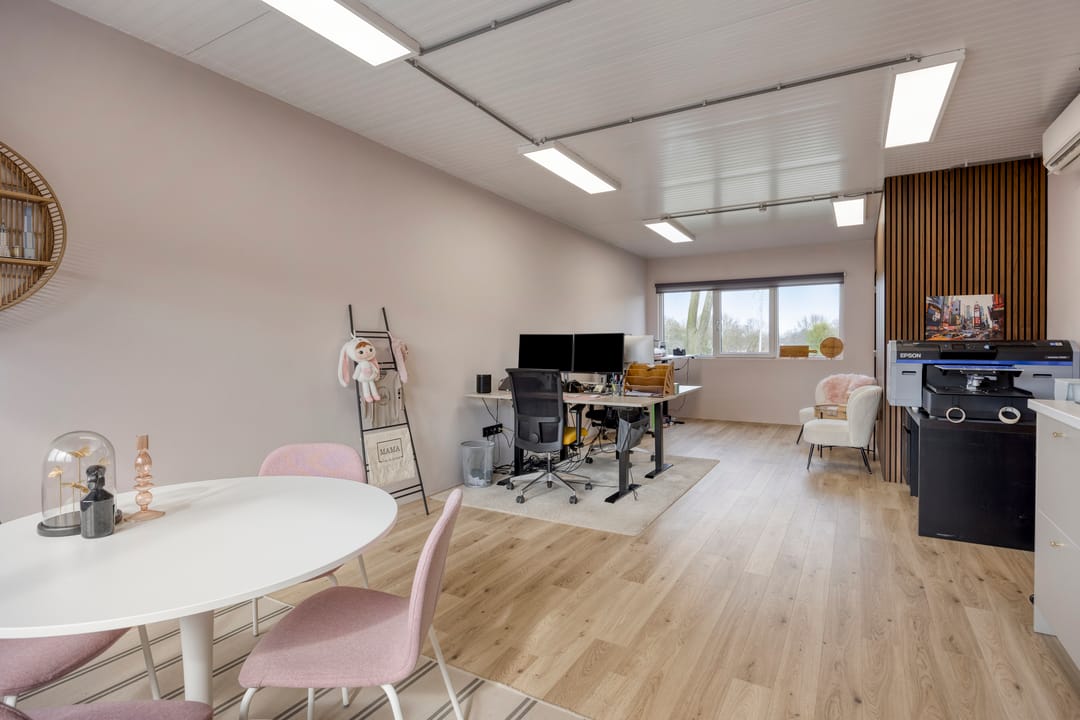 Wat deze turn-key unit bijzonder maakt, is de ligging en het daglicht. Door de ramen aan twee zijden voelt de ruimte open en prettig aan, met bovendien een fraai uitzicht op het omliggende groen en water. Dat zorgt niet alleen voor een representatieve uitstraling, maar ook voor een inspirerende werkomgeving.