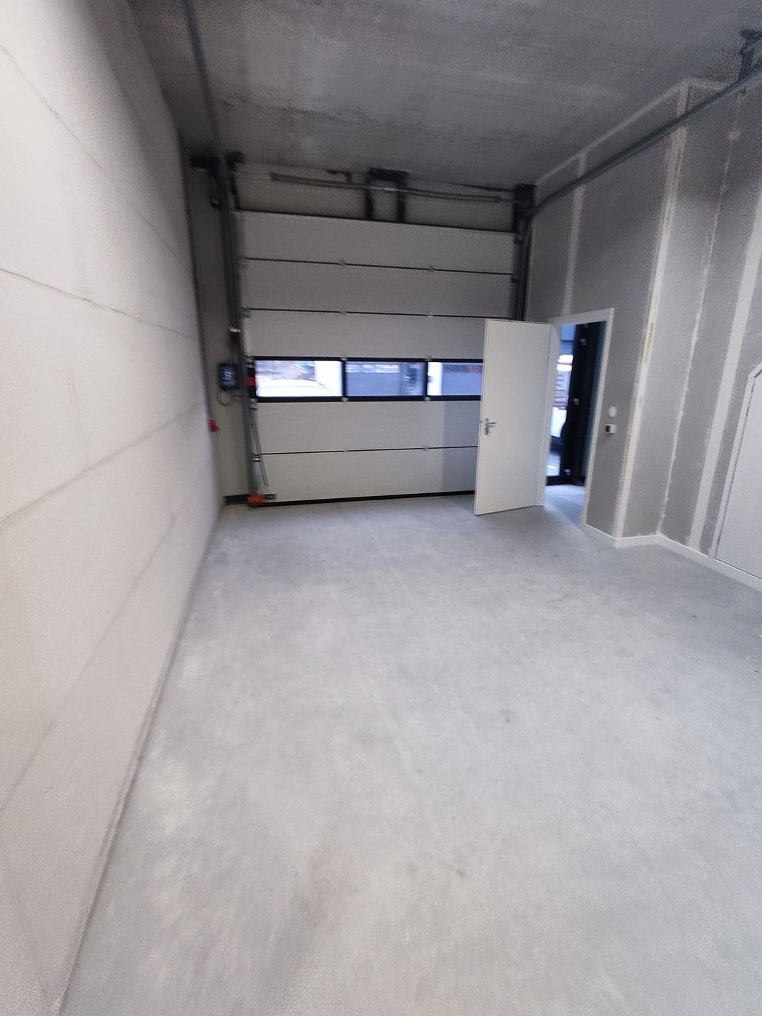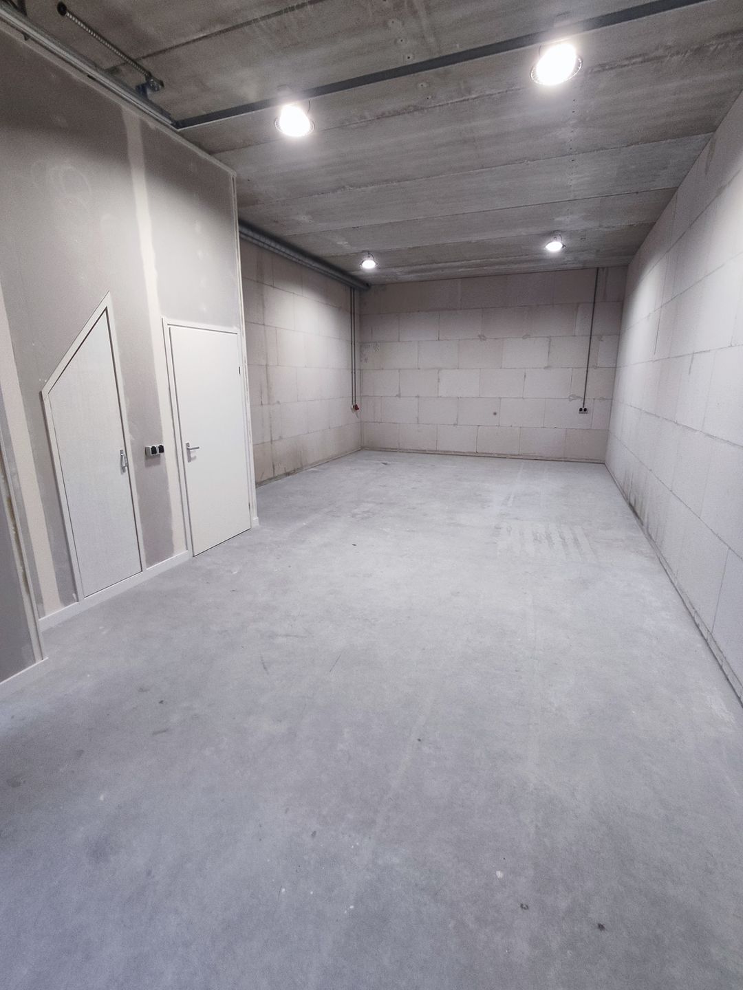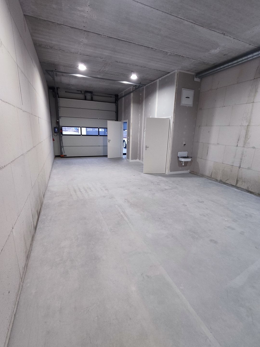 The ground floor has a concrete floor with a maximum load of 1,000 kg/m² (15 kN/m²), an electric overhead door measuring 3200x3000 mm (WxH), industrial LED spotlights, and two three-phase power points.