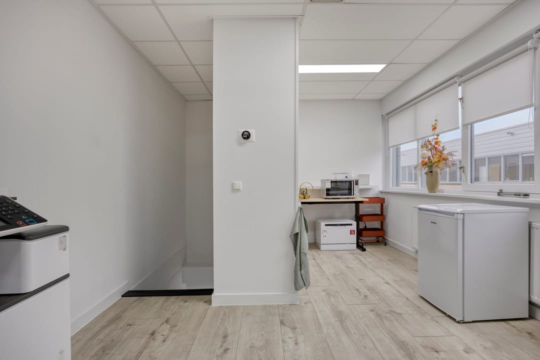 De 1e verdieping is ingericht als kantoorruimte en is voorzien van een pantry en wordt verwarmd middels een centrale verwarmingsinstallatie (cv).