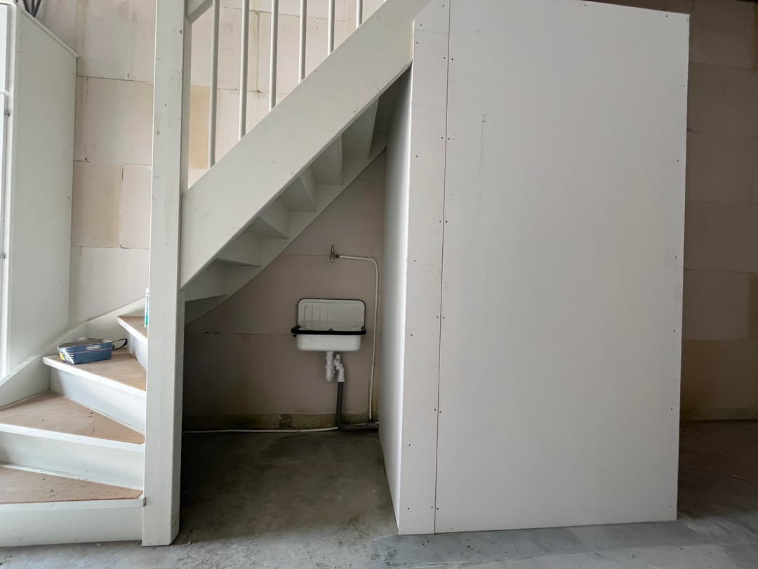 • Begane grond: bedrijfsruimte met elektrisch bedienbare overheaddeur, aparte loopdeur en een toiletruimte onder de trap.