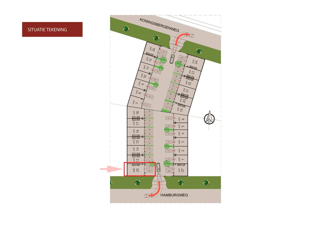 De groenvoorzieningen met bomen en plantvakken creëren een prettige en uitnodigende verblijfsomgeving. Aan beide zeiden van het terrein bevindt zich een op afstand bedienbaar toegangshek. Er is plaats voor uw reclame-uiting (0,6 x 3,6 meter) op de voorgevel van uw unit.