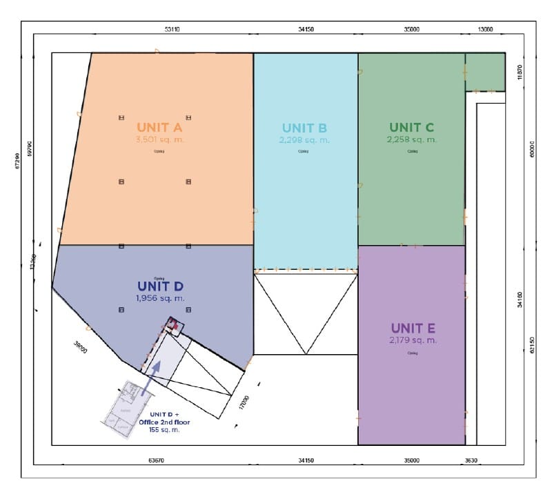 Approximately 12,348 sq. m. of logistics space is currently available for lease, divided into 5 interconnected units: