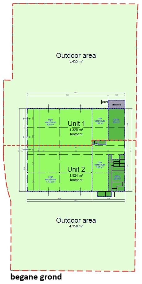 Unit 1, totaal groot circa 1.722 m² en 5.455 m² buitenruimte, als volgt verdeeld: