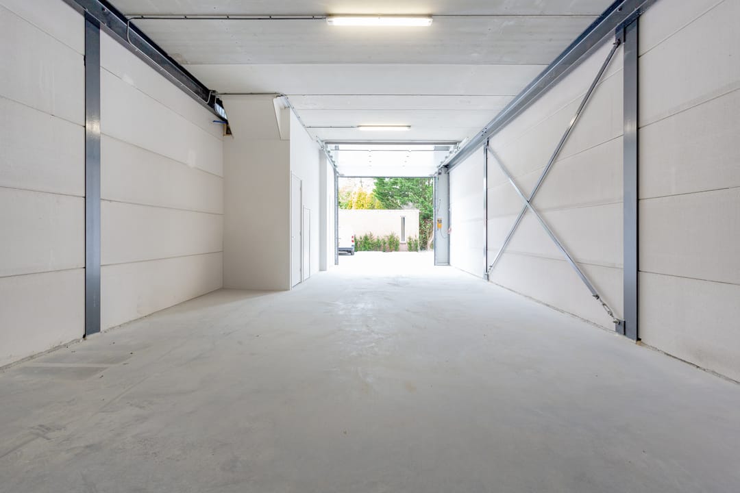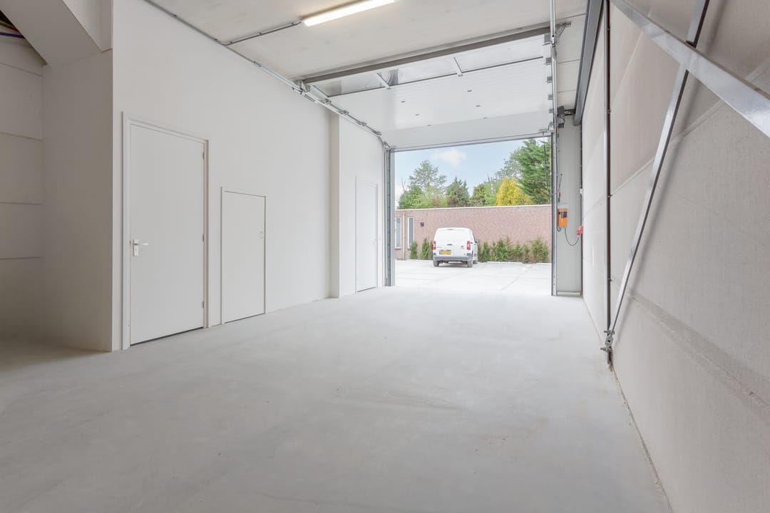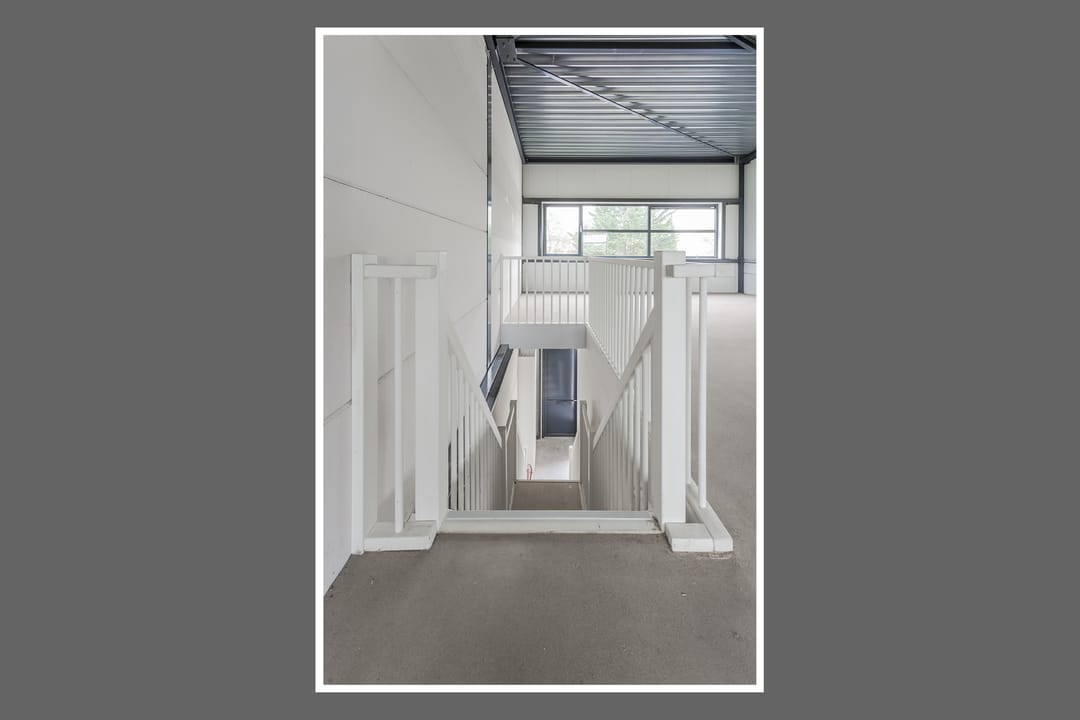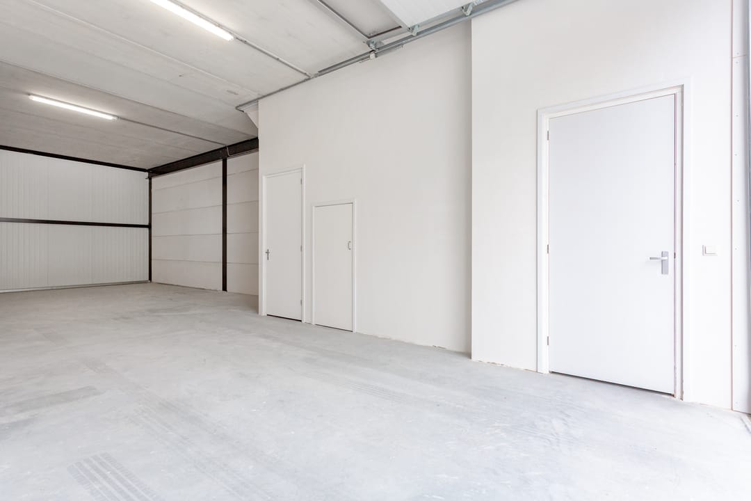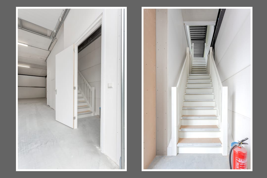 De begane grond is aan de voorzijde voorzien van een elektrische overheaddeur en loopdeur met ramen. Aan de rechter zijde van de ruimte bevindt zich een entreehal met meterkast en een trap naar de kantoorverdieping. De verdieping heeft aan de voorzijde en achterzijde grote ramen. Op de begane grond is een toiletruimte met fonteintje aanwezig.
