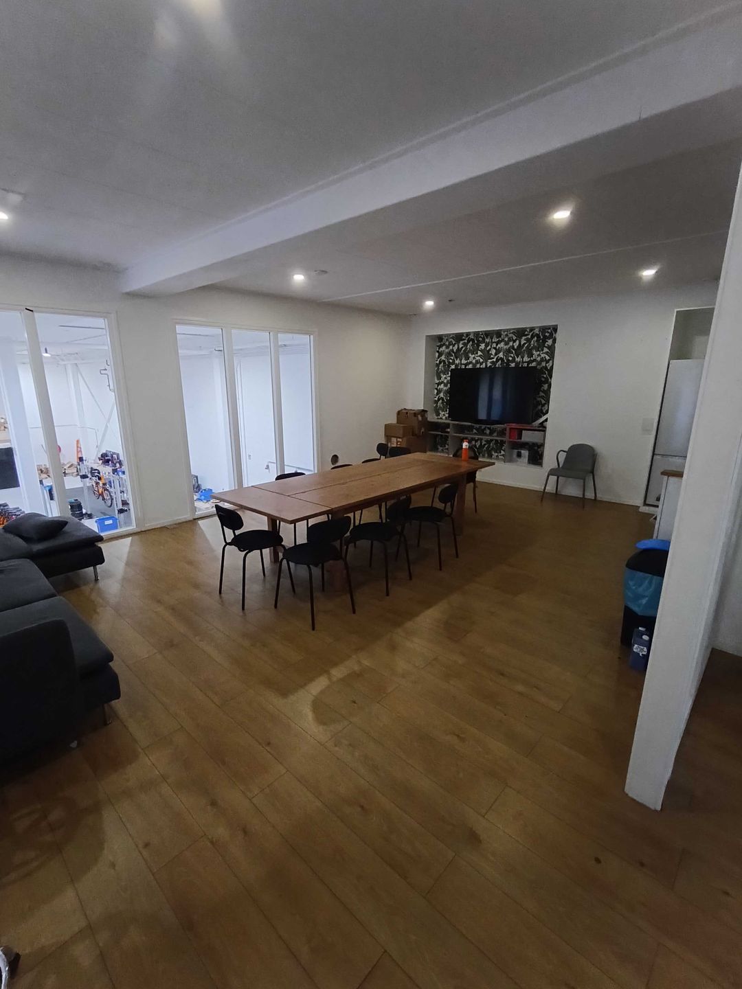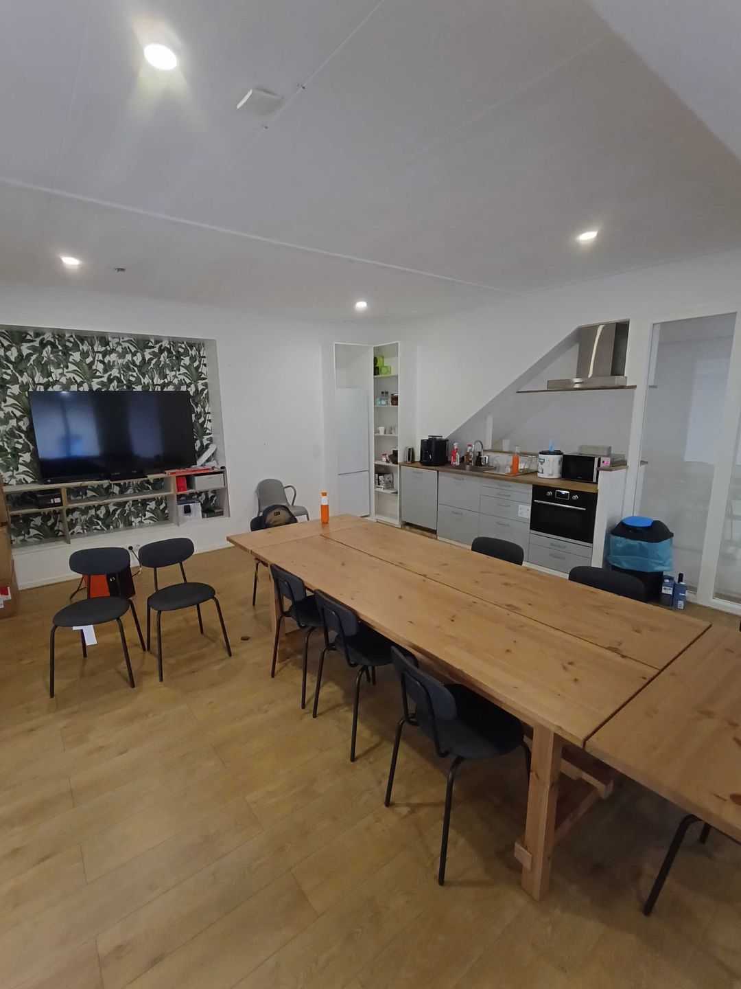 -Een sfeervolle lunch- en vergaderruimte met uitzicht over de volledige warehouse