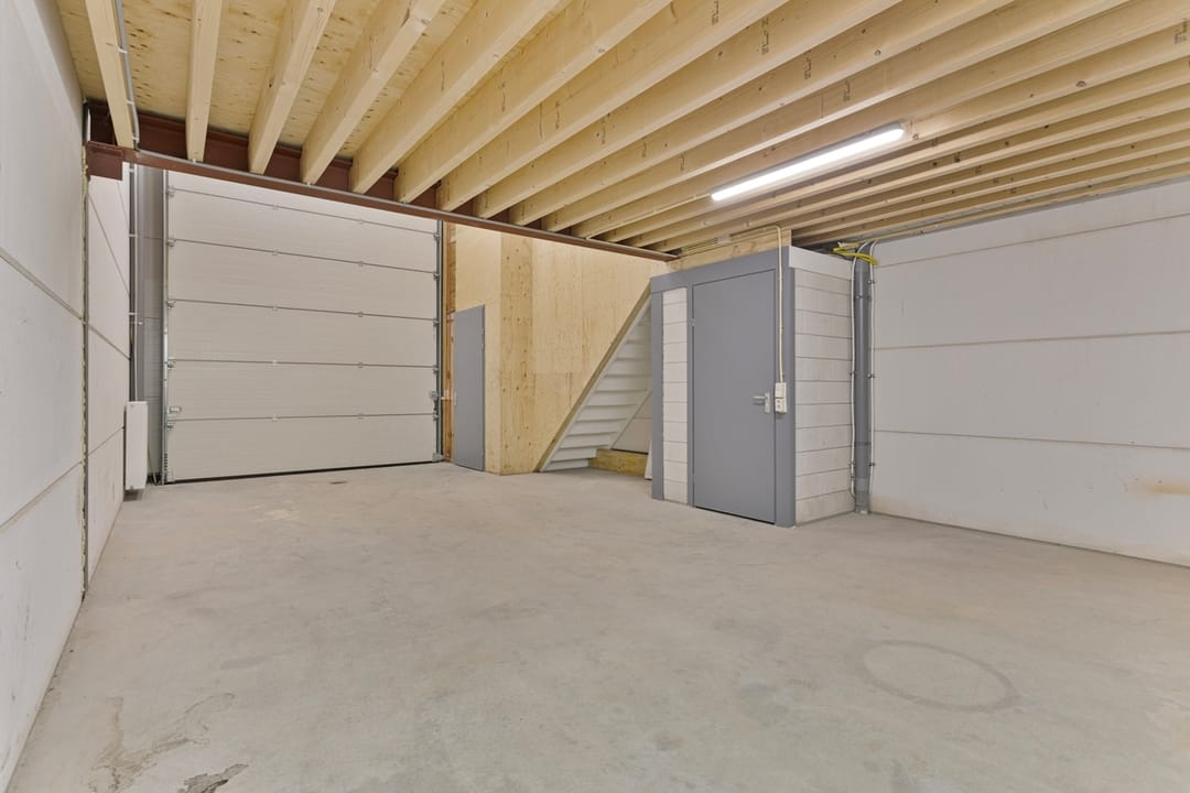 The storage area has an open layout, offering many logistical possibilities. The roller door allows for easy loading and unloading. A toilet is also located in the storage area.