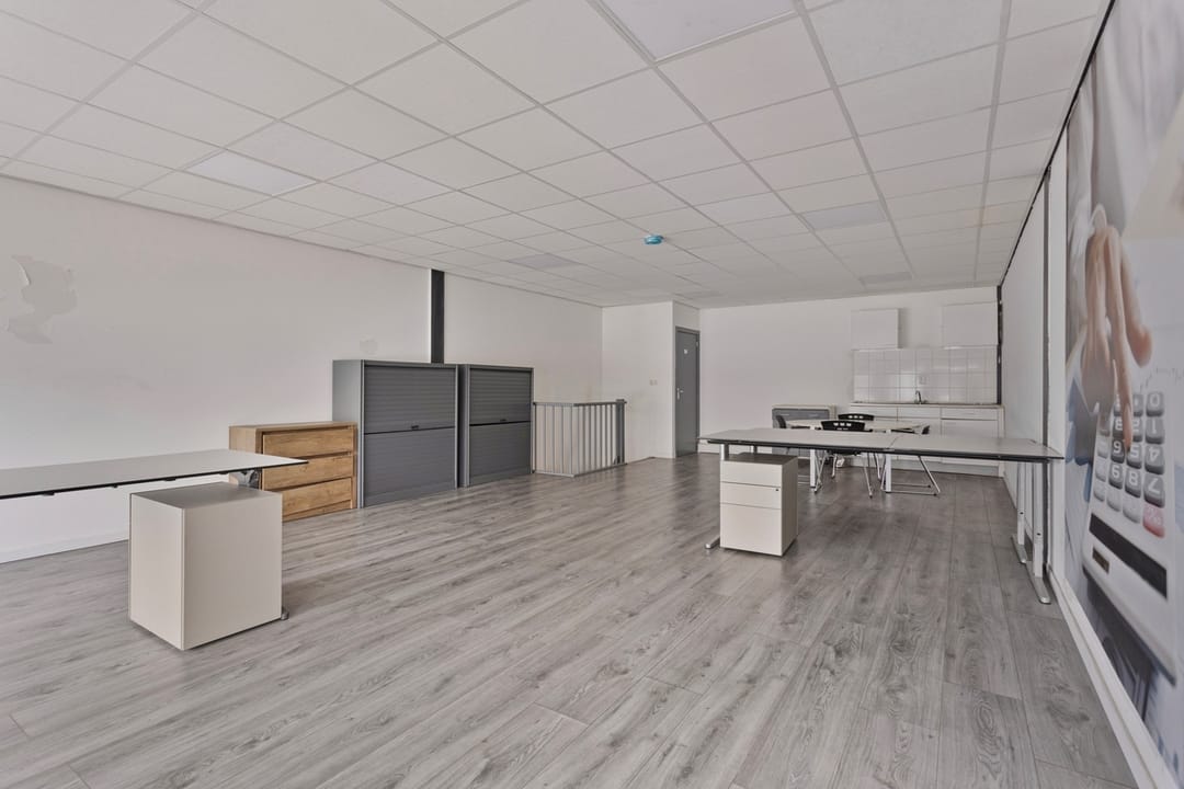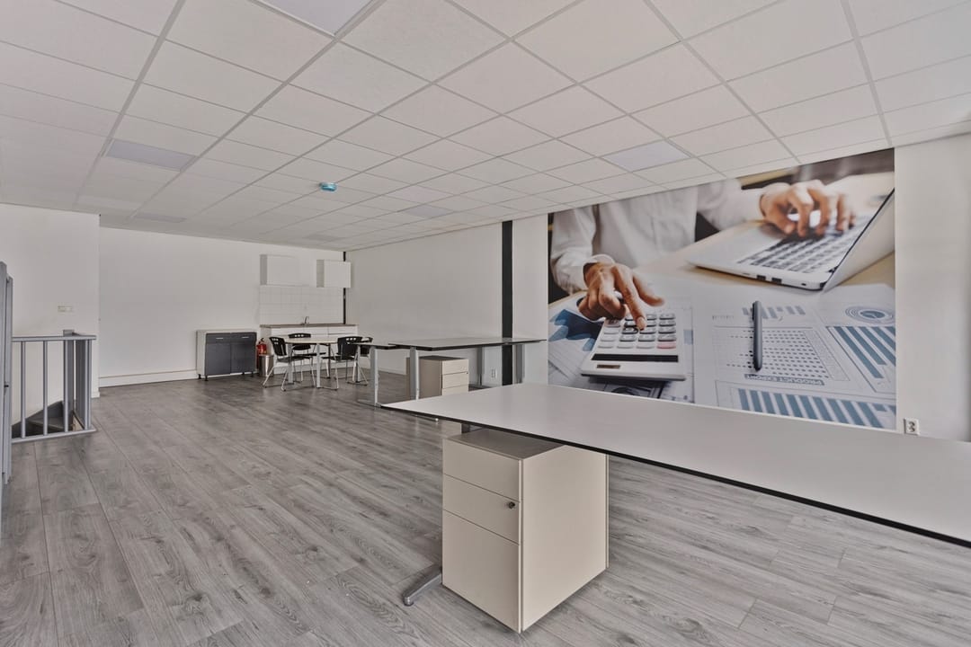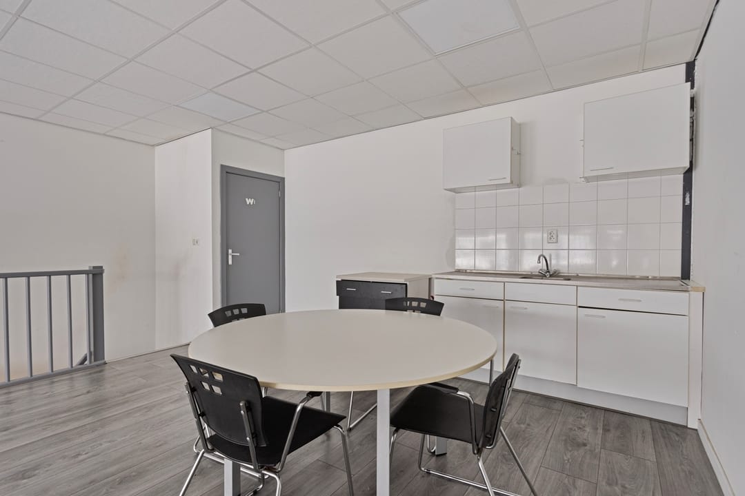 Wanneer u de trap vervolgt naar de 2e verdieping, arriveert u in het grote kantoor. Deze open ruimte wordt dankzij de raampartijen van veel natuurlijk daglicht voorzien. De open indeling biedt veel mogelijkheden voor het plaatsen van bureaus en tafels, ideaal om naar uw eigen wens in te richten. In de hoek is een keukenblok aanwezig, geschikt om lunch te prepareren.