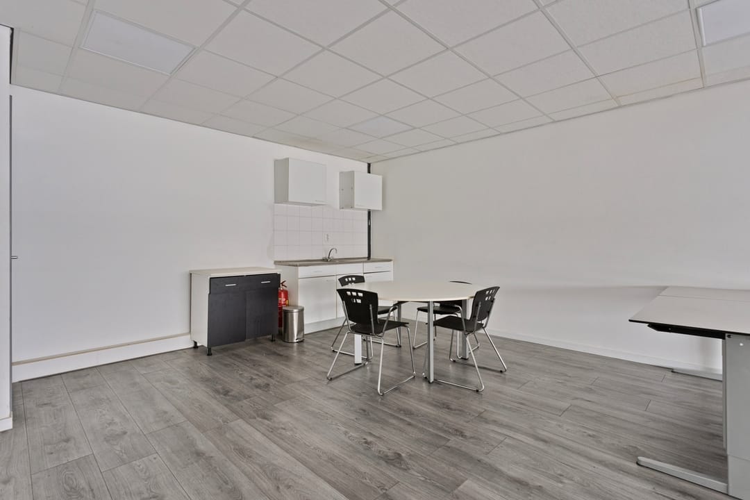 Continuing up the stairs to the second floor, you arrive at the large office area. This open space benefits from ample natural daylight thanks to the windows. The open layout offers many options for placing desks and tables, making it easy to customize to your needs. In the corner, there is a kitchenette suitable for preparing lunch.