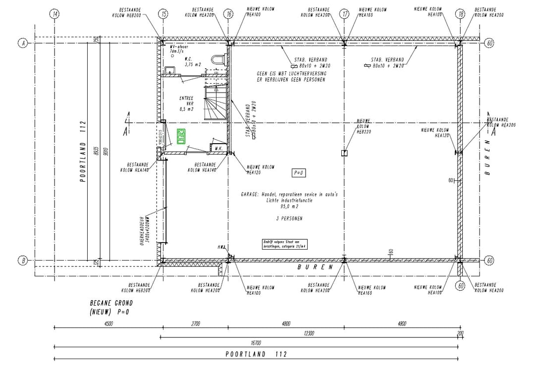 - Begane grond (ca. 95 m²): Bedrijfsruimte met een vrije hoogte van circa 3,65 meter, voorzien van entree en toiletruimte