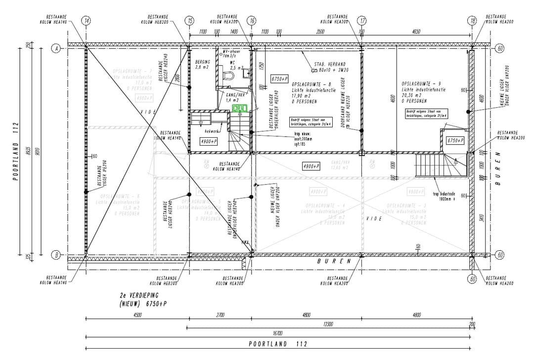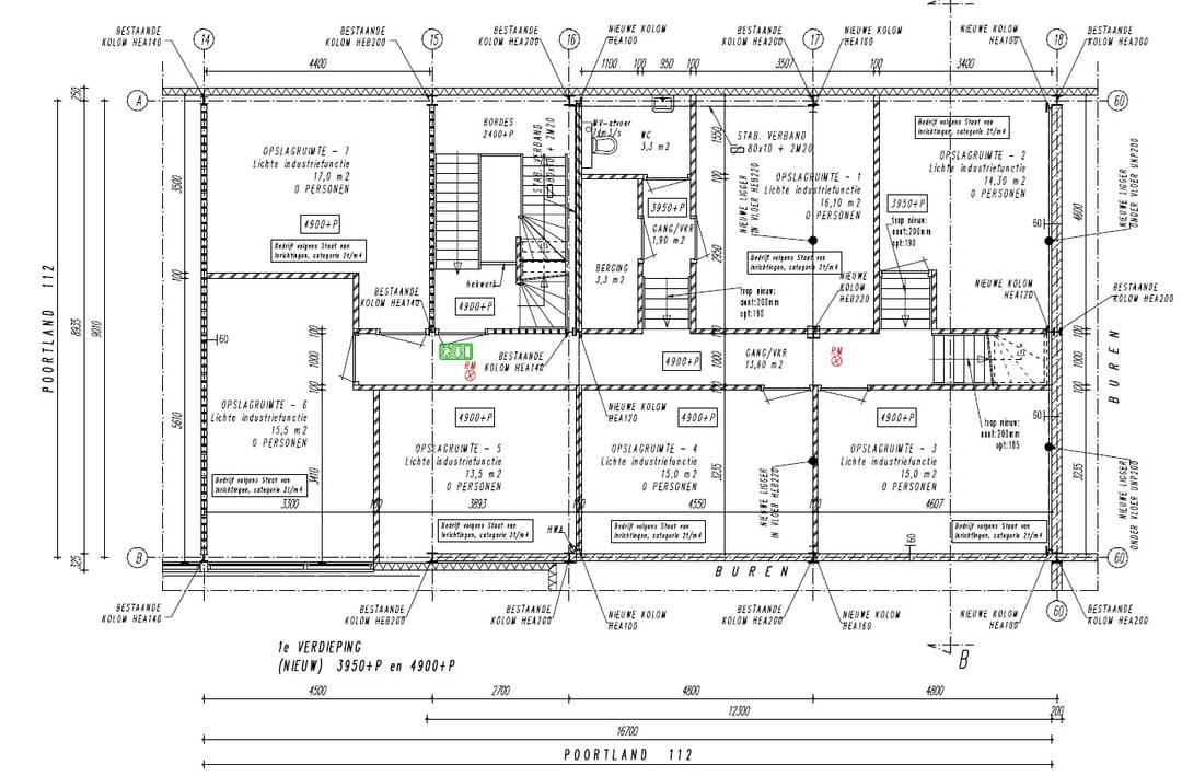 - Eerste verdieping: Zeven afzonderlijke ruimtes (ca. 13,5 – 17 m²), berging en toilet