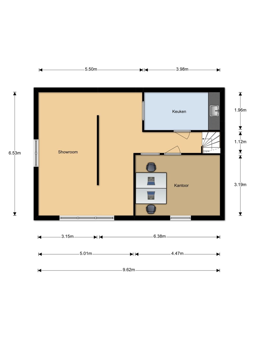 Afmeting: effectief circa 9,6 x 6,5 meter.