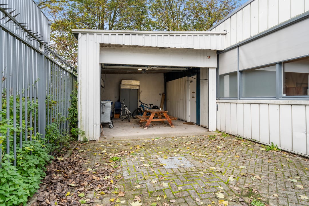 - Garage met elektrische garagedeur aan de zijkant van het gebouw.