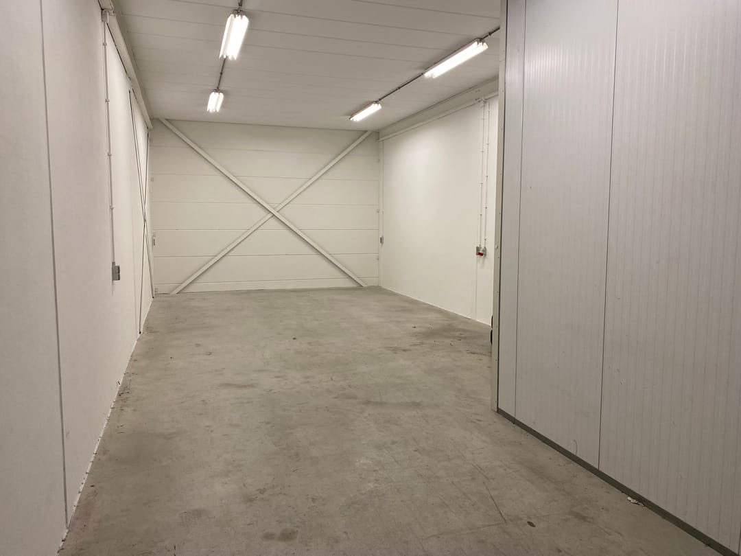 • Bedrijfshal van circa 65 m² met handmatige sectionaaldeur en TL-verlichting.