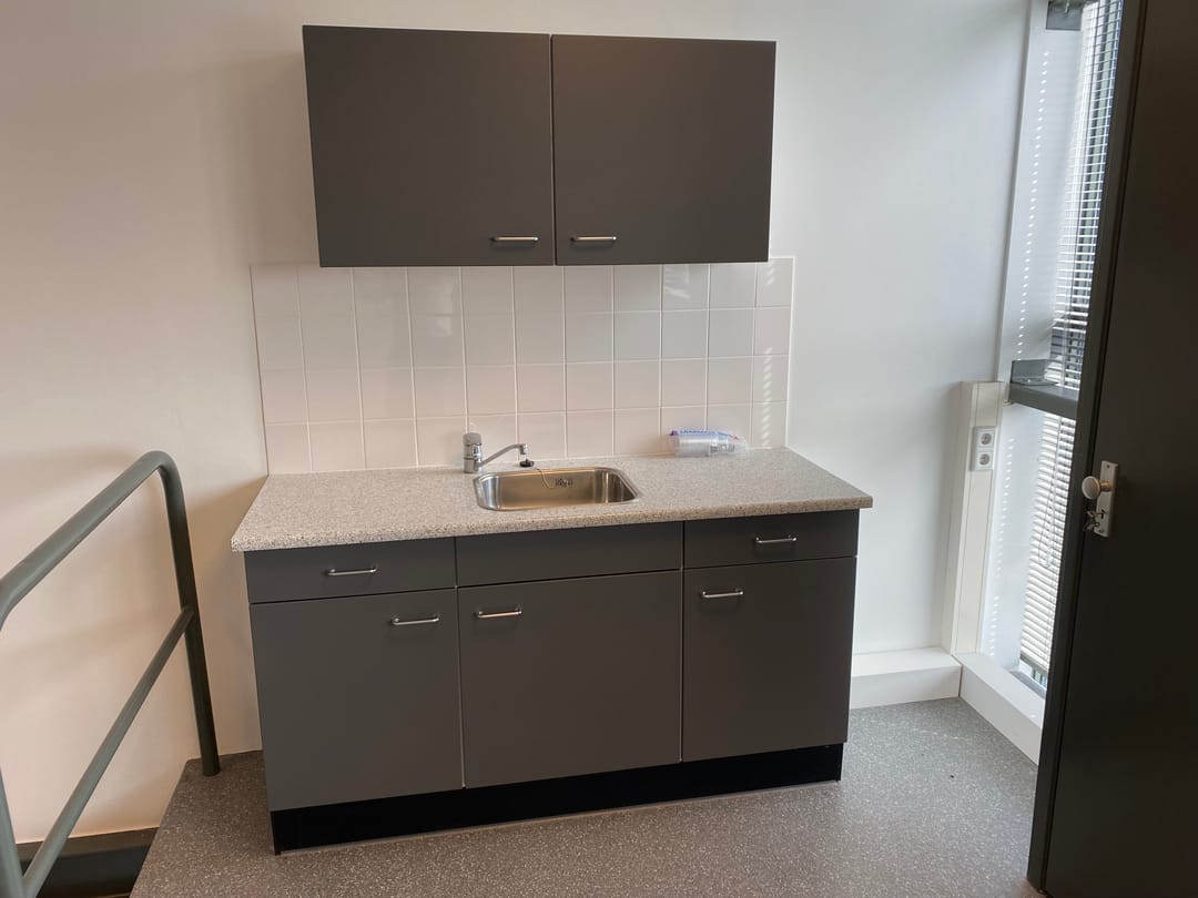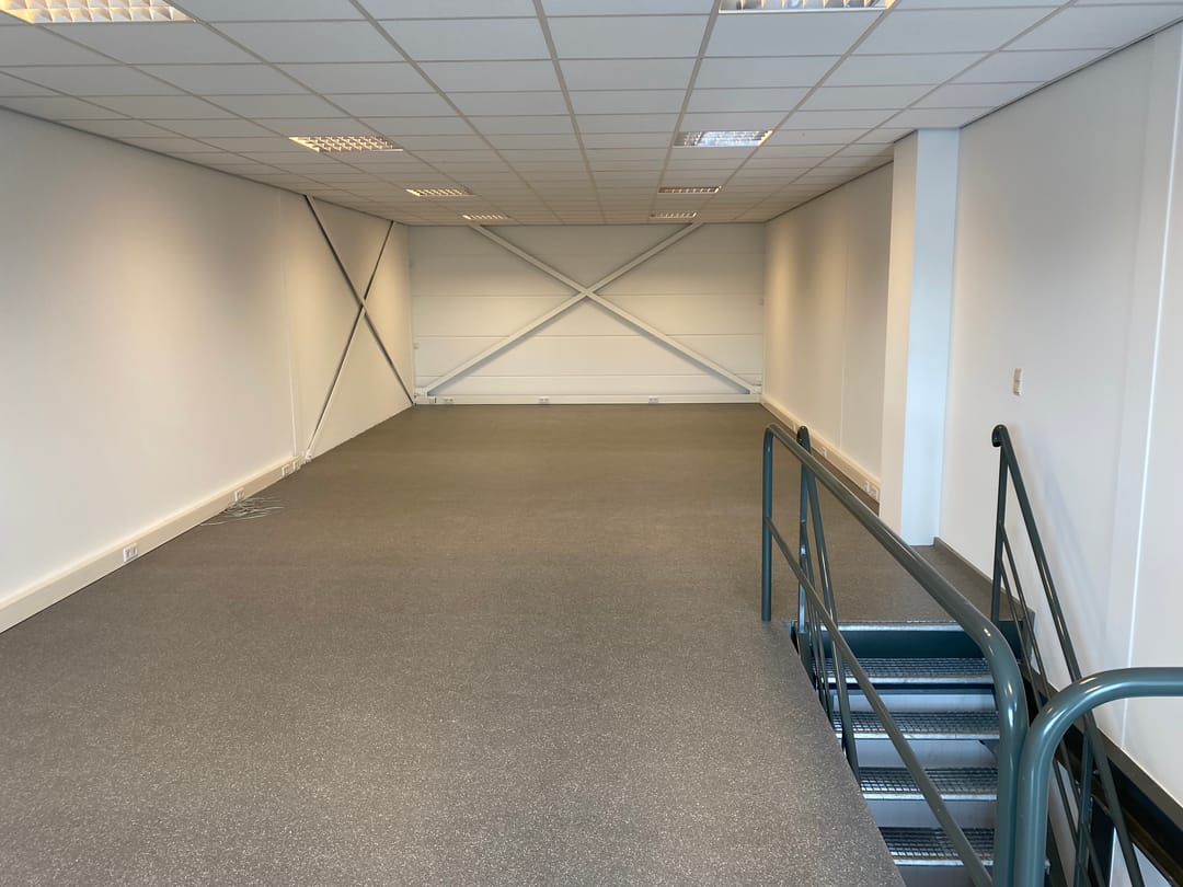 • Kantoorruimte van circa 77 m² (afmeting: circa 5,27 m x 14,88) met vaste kast waarin cv-ketel (Nefit) en een keukenblokje voorzien van een spoelbak en een close-in boiler. De ruimte is voorzien van zeil op de vloer en een systeemplafond met tl-verlichting.