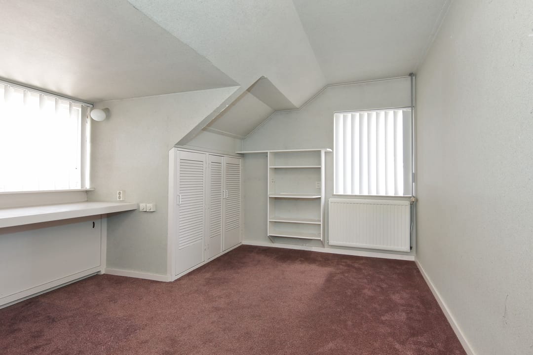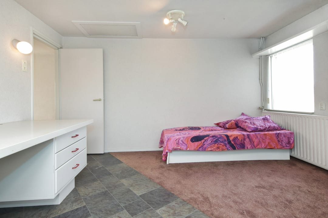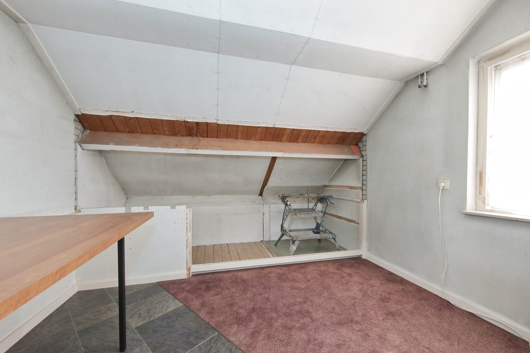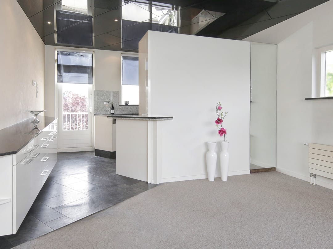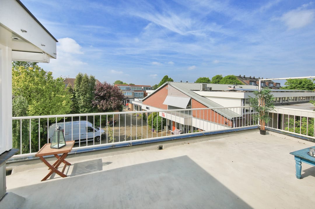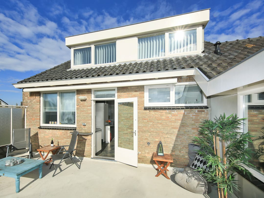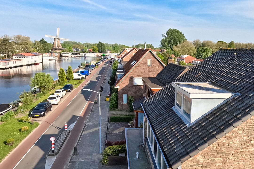 From this original double upstairs apartment, you can gaze for hours at the street, the water, the greenery, and the sky. Relax on the enormous terrace at the back, comfortably situated on the southwest side. The first floor of the apartment offers almost 100 m² of space. For inspiration, we've added some artist's impressions, for example, to combine the living room (38 m²) with the side room (12 m²) into one space and integrate it into the current semi-open kitchen (12 m²). This floor also features a (bed)room of almost 28 m² that runs from front to back and offers many possibilities, especially because the bathroom and toilet are adjacent to this space.