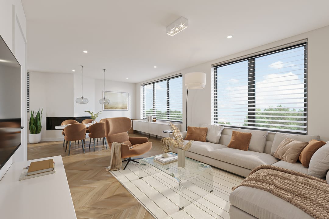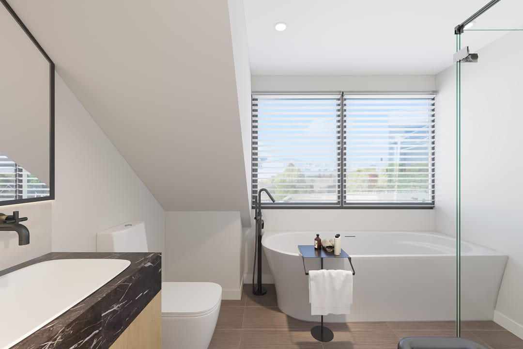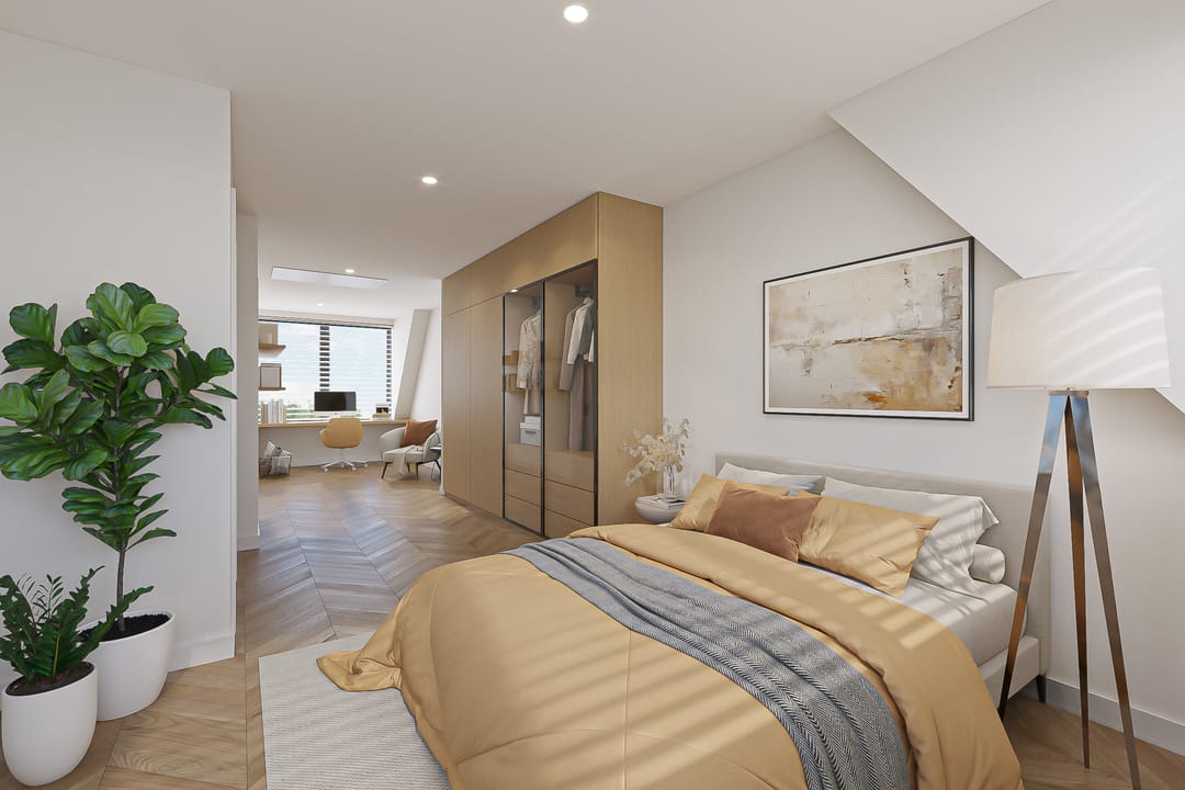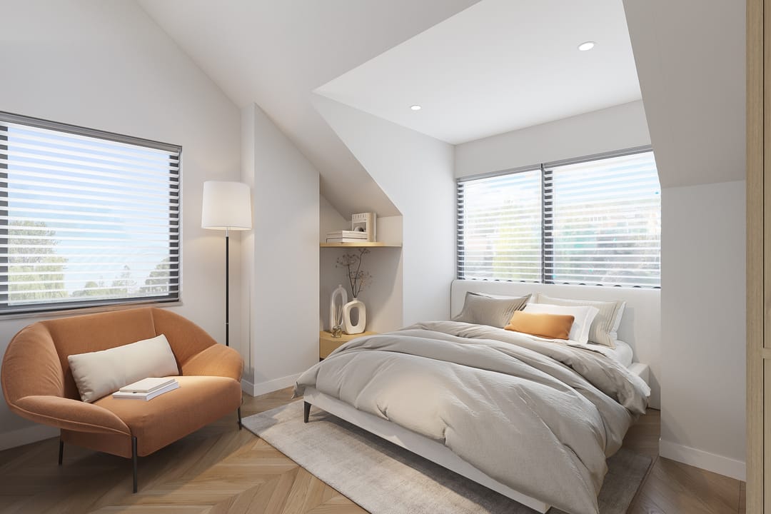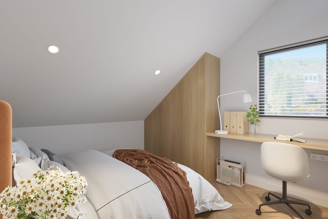 We've also added inspiring images for the upper floor, which currently features three rooms measuring 10, 17.5, and 20 m², plus a laundry room. These images demonstrate how the bedrooms can easily be transformed into luxurious spaces with relatively minor modifications. One of the renderings also shows that a second bathroom is easily created here. The attic will serve as space for unnecessary storage.