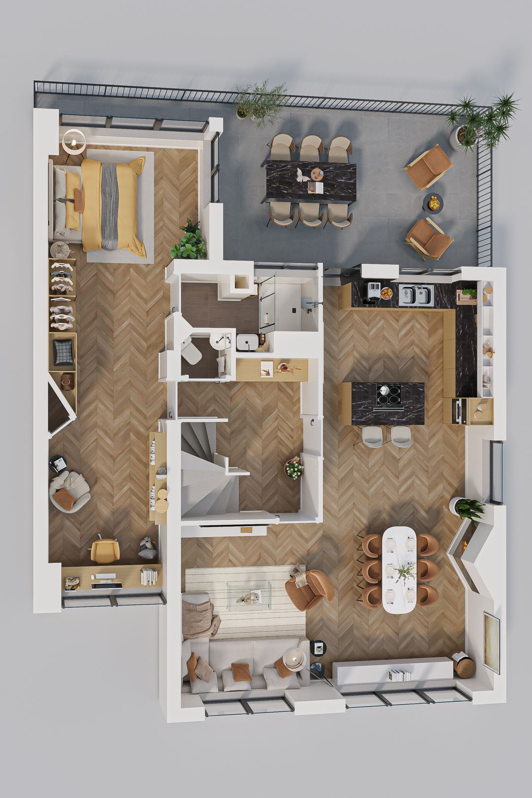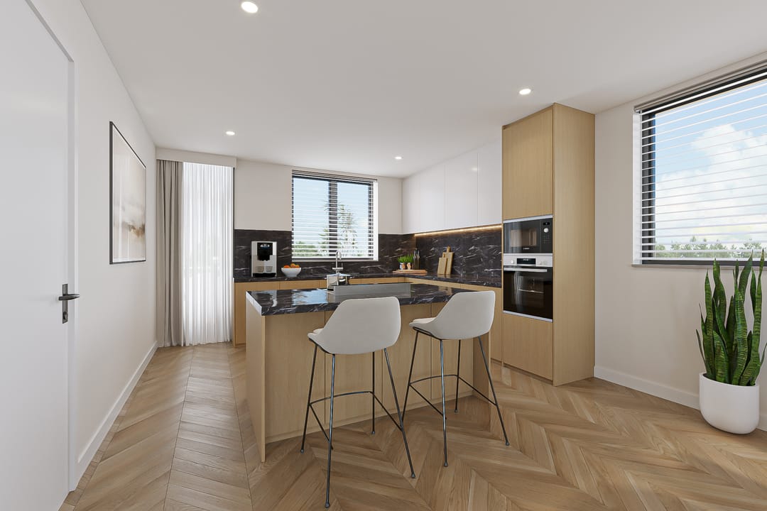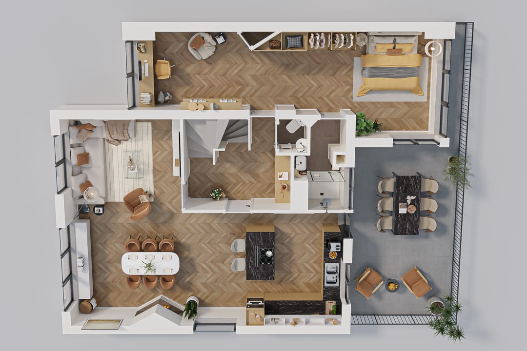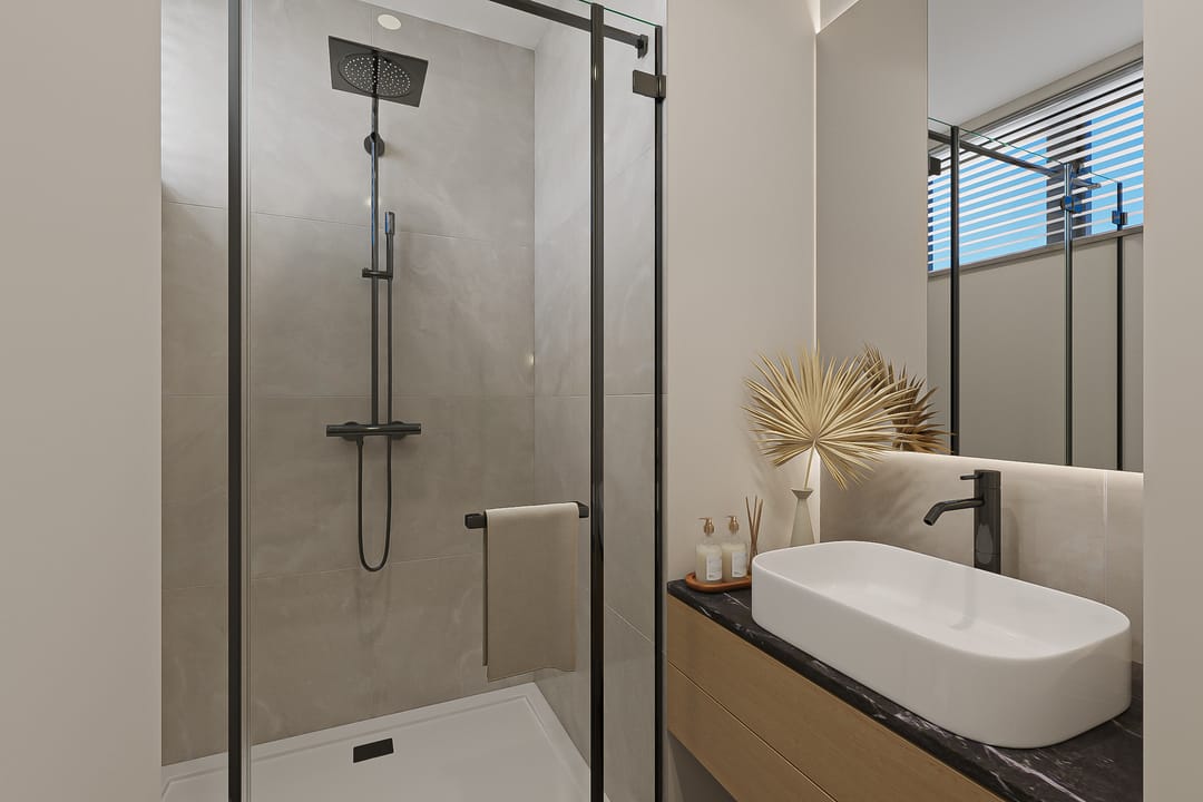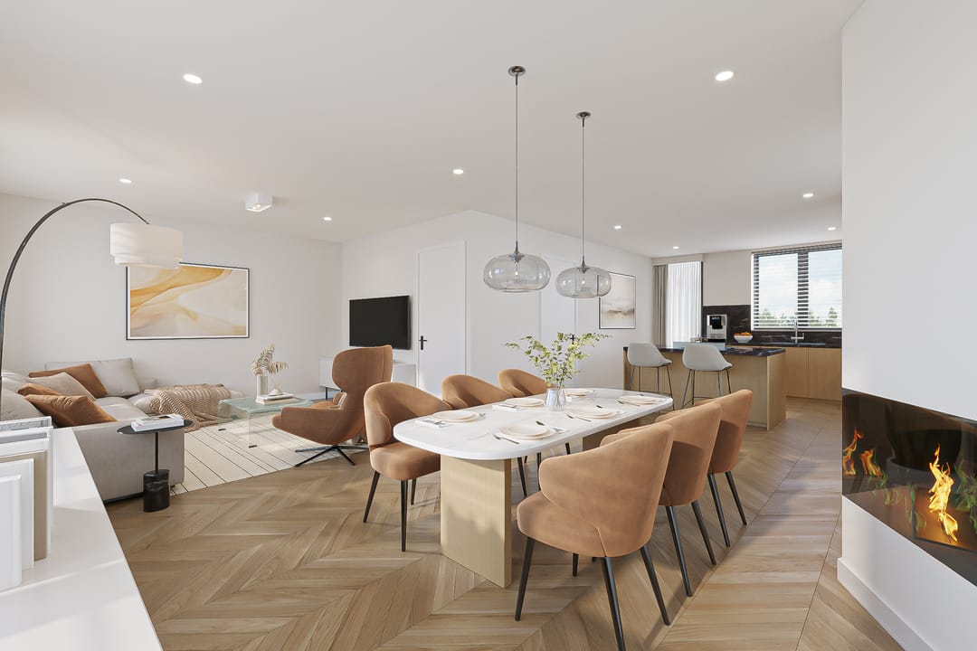 We've also added inspiring images for the upper floor, which currently features three rooms measuring 10, 17.5, and 20 m², plus a laundry room. These images demonstrate how the bedrooms can easily be transformed into luxurious spaces with relatively minor modifications. One of the renderings also shows that a second bathroom is easily created here. The attic will serve as space for unnecessary storage.