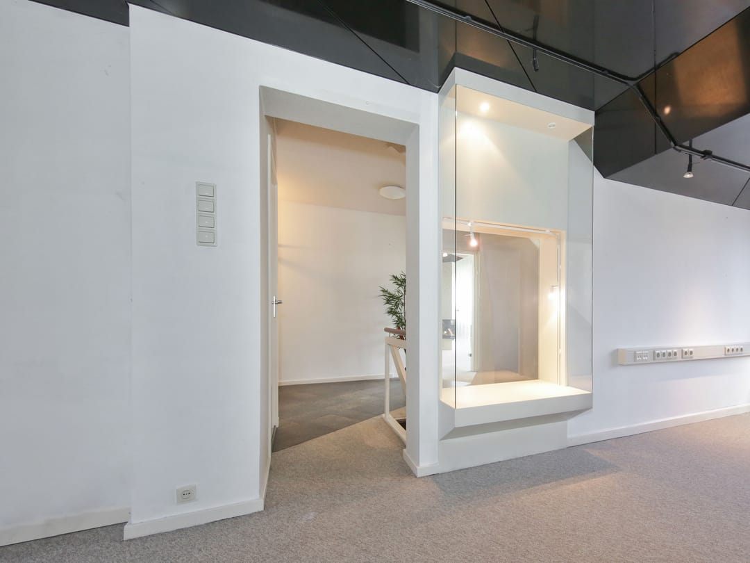 The L-shaped commercial space of approximately 50 m² is approximately 10 meters deep and approximately 6.4 meters wide at the rear. Under the stairs, there is an additional space with a sink and an adjoining storage room of approximately 11 m² with access to the basement.