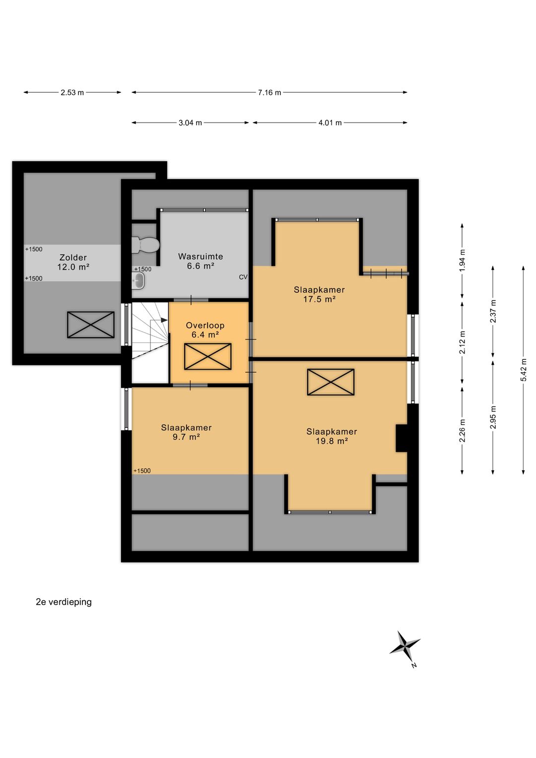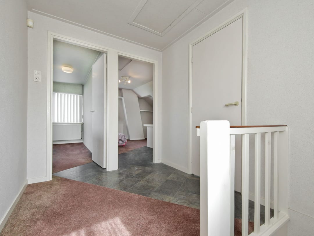 Landing with a separate loft. From the landing, there is access to all rooms, including the laundry room with a dormer window of approximately 7 m², including a toilet, sink, and central heating boiler. Two bedrooms at the front are approximately 10 m² and 20 m², the latter of which has a dormer window and its own loft, and a bedroom at the front of the house of approximately 18 m² with a dormer window.