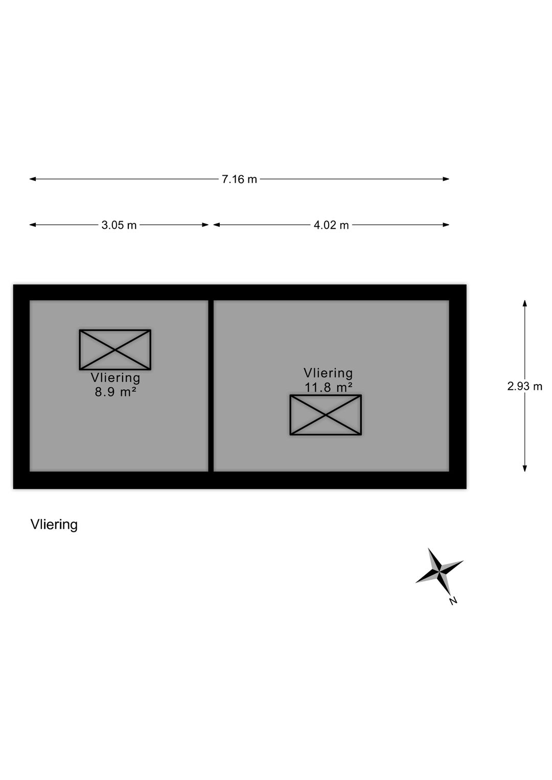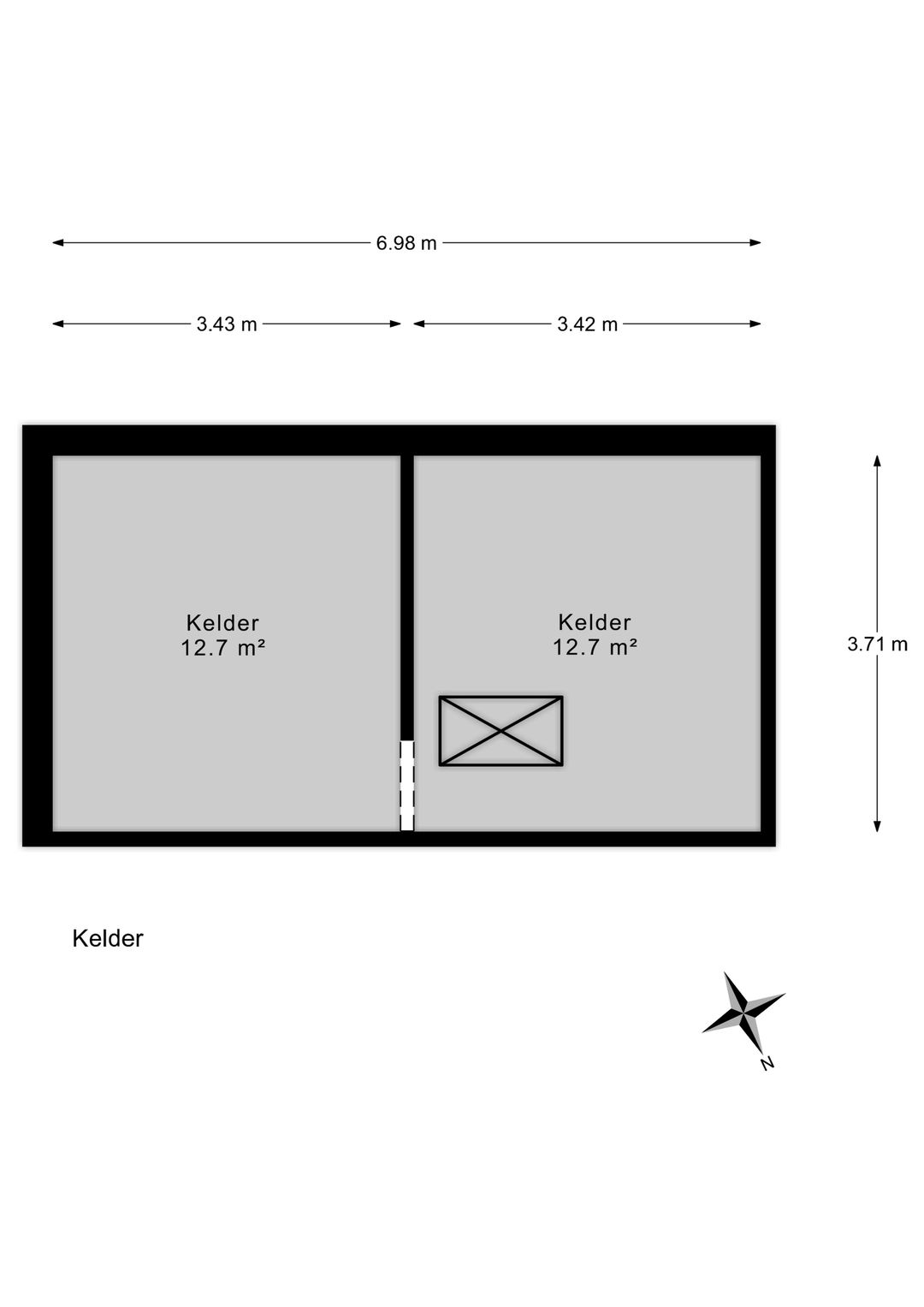 The cellar consists of two sections, each approximately 13 m², with each section approximately 3.4 meters wide and 3.7 meters deep.