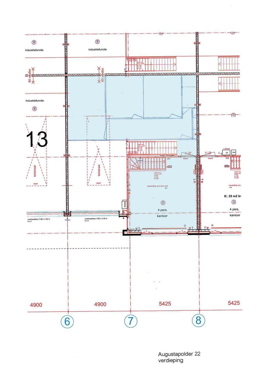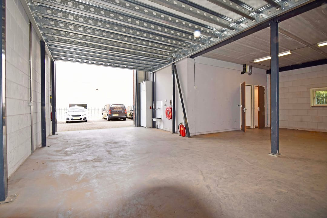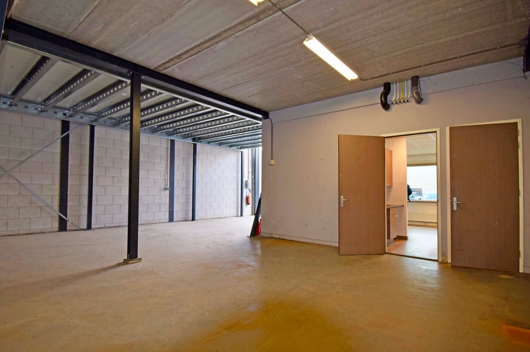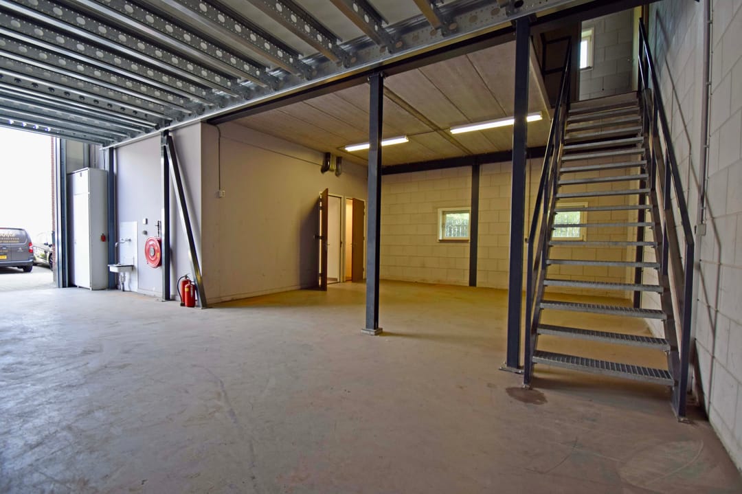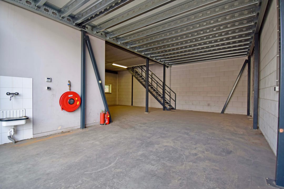 - Solide entresolvloer, maximale vloerbelasting 500 kg/m², voorzien van stalen trapopgang, verlichting en hekwerk;