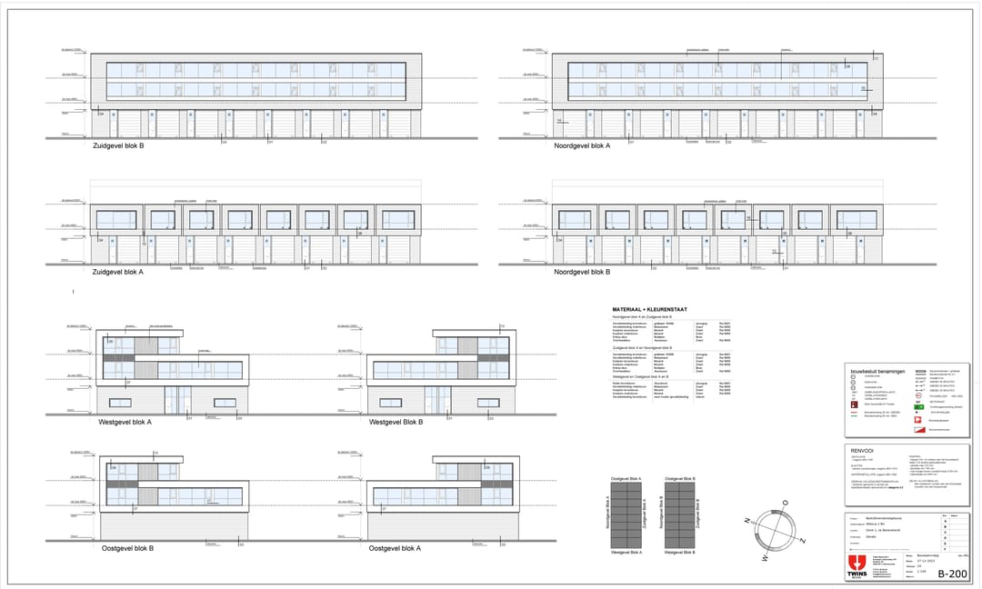 - gevels begane grond metselwerk met daarboven sandwichpanelen, geïsoleerde gevelbeplating (Rc-4,5) en deels hout sierelementen;