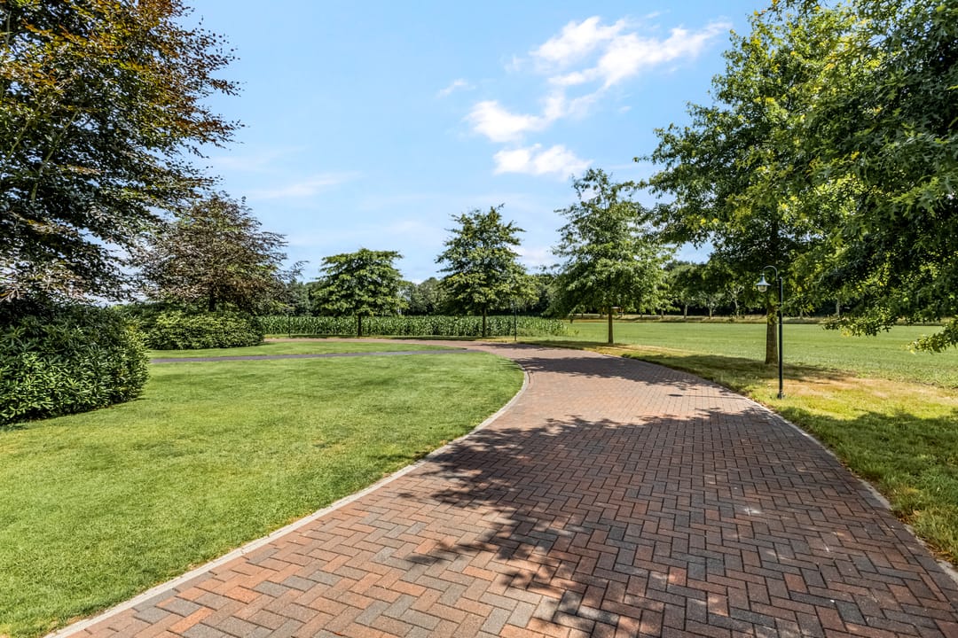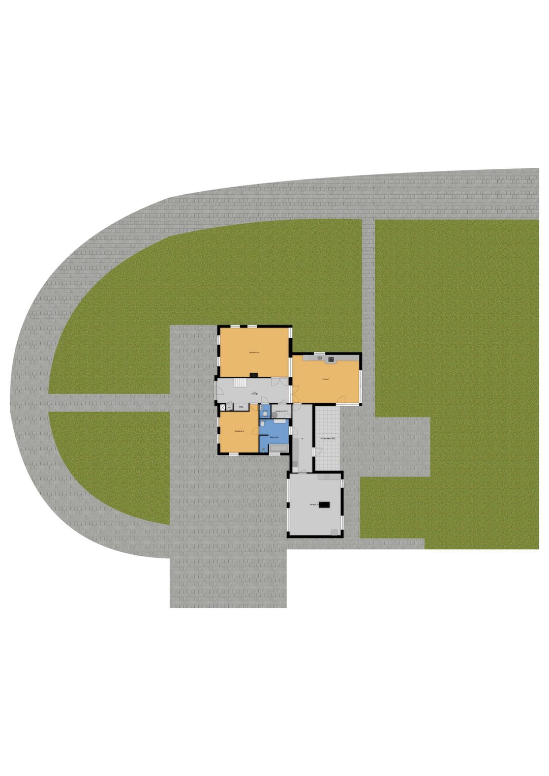 Het geheel is omringd door solide erfverharding bestaande uit overwegend keramische klinkers. Aan de zijkant zijn er stelconplaten aangebracht.