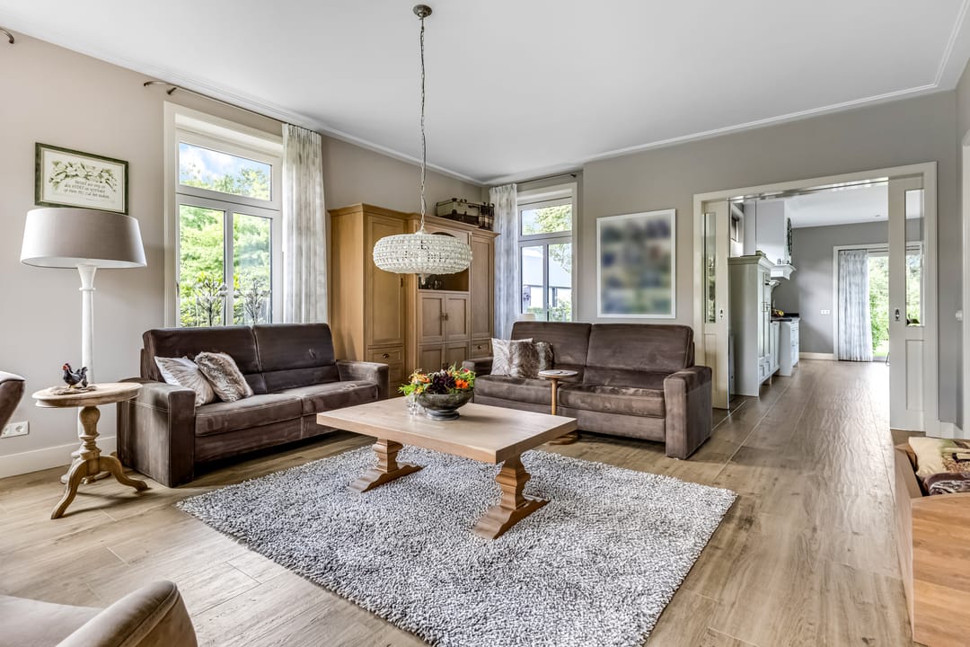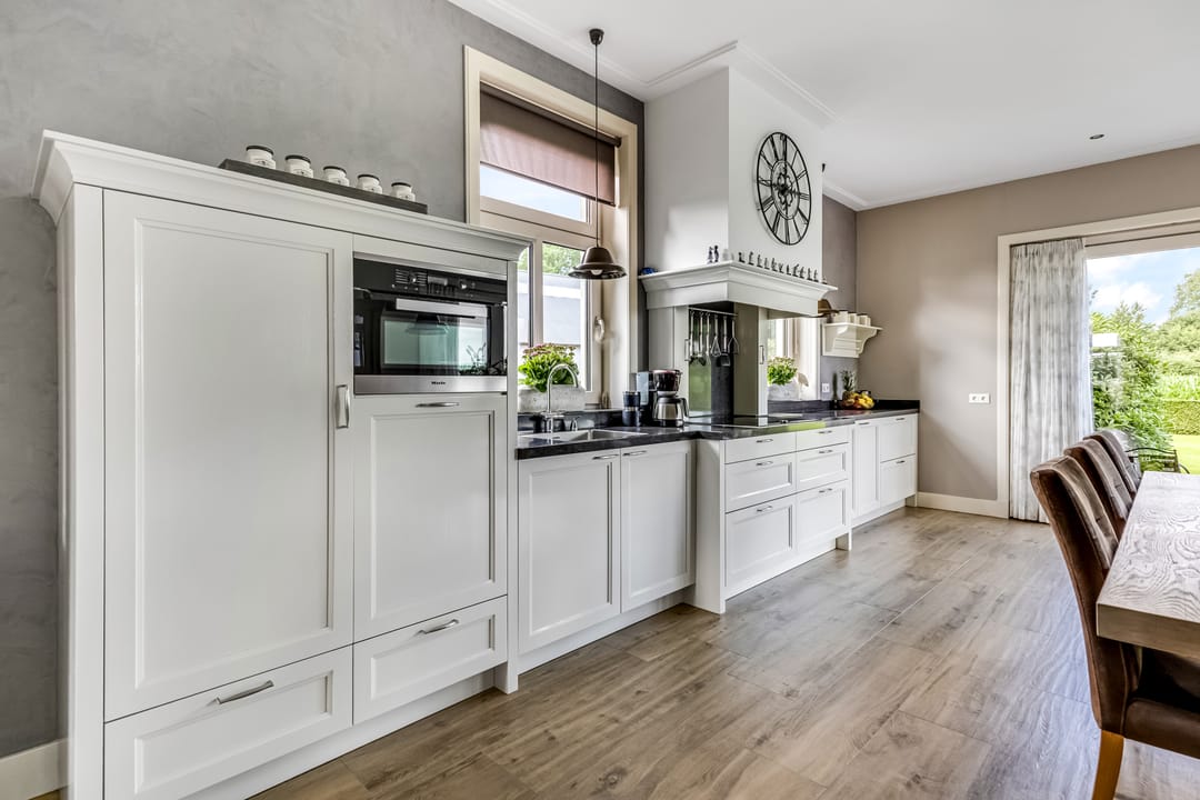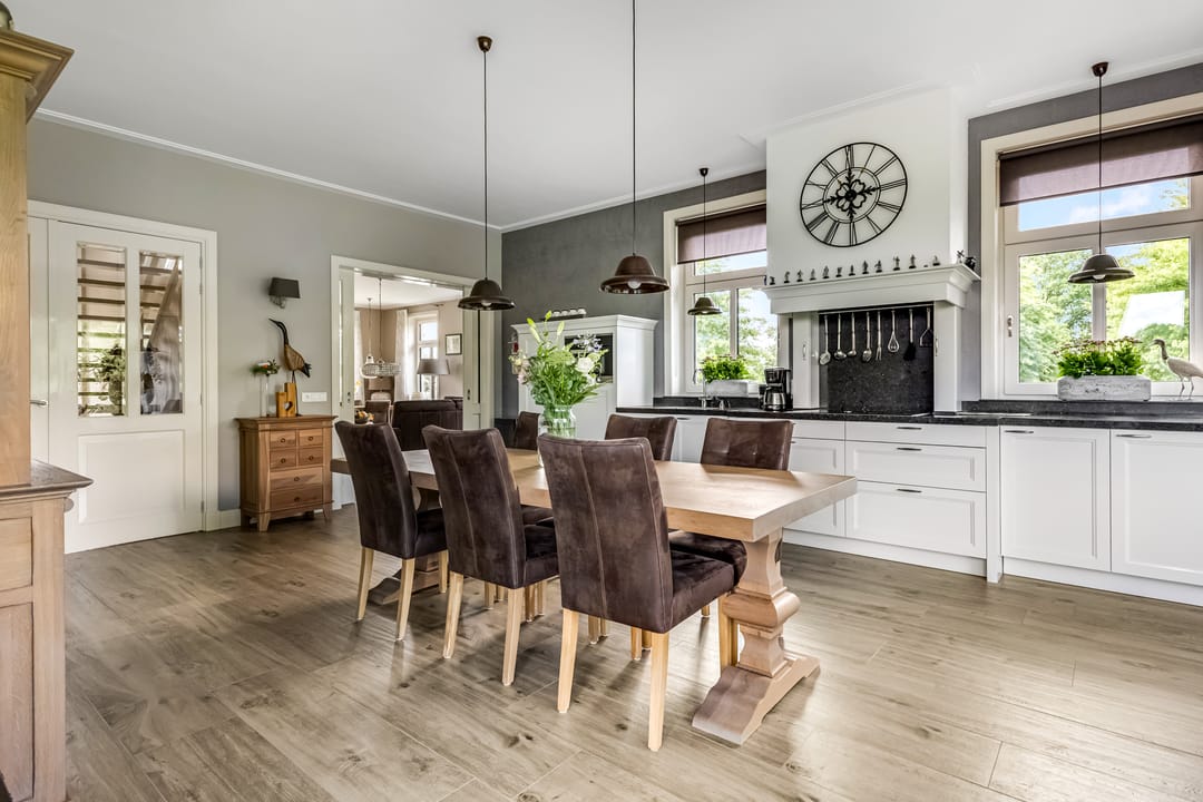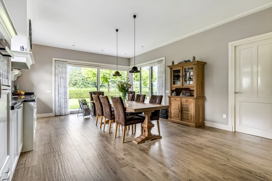 Het landelijke keukenblok met granieten blad is van alle gemakken voorzien, zoals onder andere een inductie-kookplaat, afzuigkap, heteluchtoven/magnetron, vaatwasser en koelkast. De woonkeuken biedt voldoende ruimte voor het plaatsen van een grote eetkamertafel voor het hele gezin en staat via een grote schuifpui in verbinding met de tuin en overkapping. De grote schuifpui geeft niet alleen prachtig zicht op de tuin en achterliggende landerijen, maar ook veel lichtinval in de ruimte.